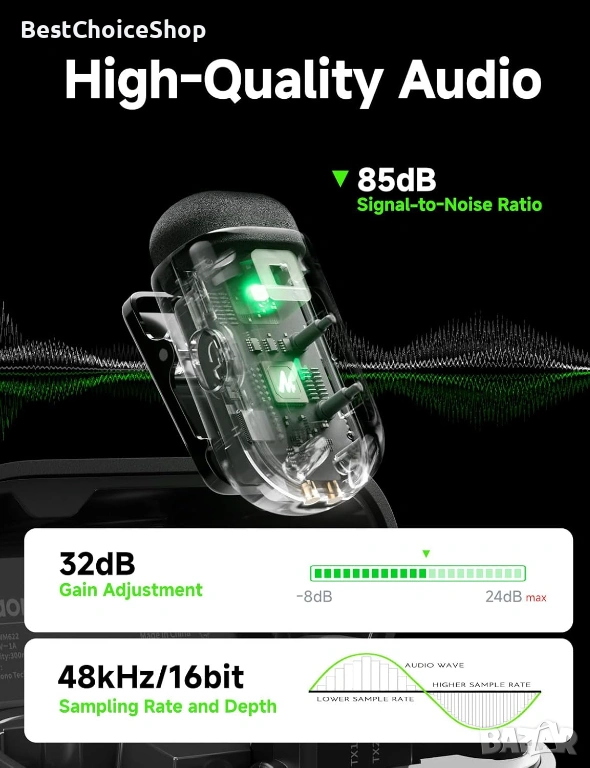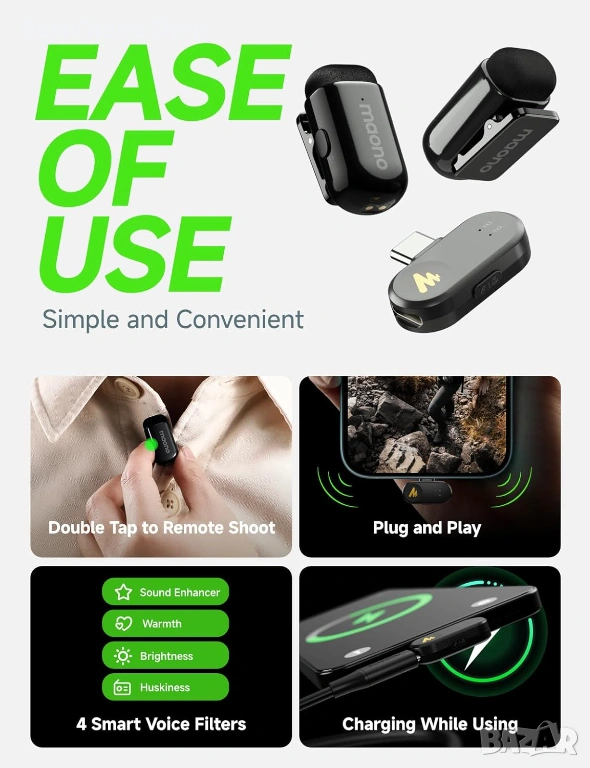 Удължен 30-часов живот на батерията: С компактен калъф за зареждане, този малък микрофон може да работи до 30 часа. Приемникът позволява зареждане на устройството ви по време на запис, без повече притеснения за изтощена батерия.