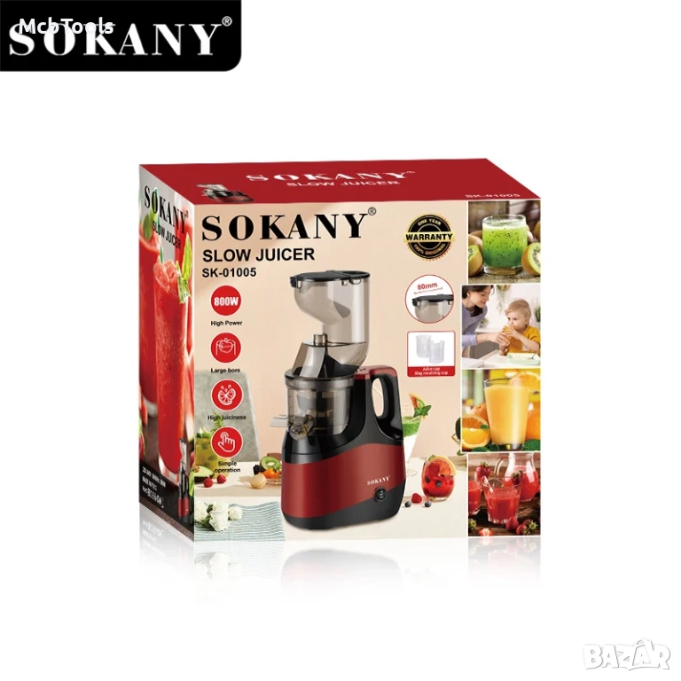 Бавна сокоизстисквачката Sokany SK-01005 е мощен и практичен кухненски уред, създаден за бързо и ефективно извличане на пресни сокове от плодове и зеленчуци. Благодарение на мощния 800W мотор, уредът осигурява висока производителност и стабилна работа при приготвяне на здравословни напитки у дома.