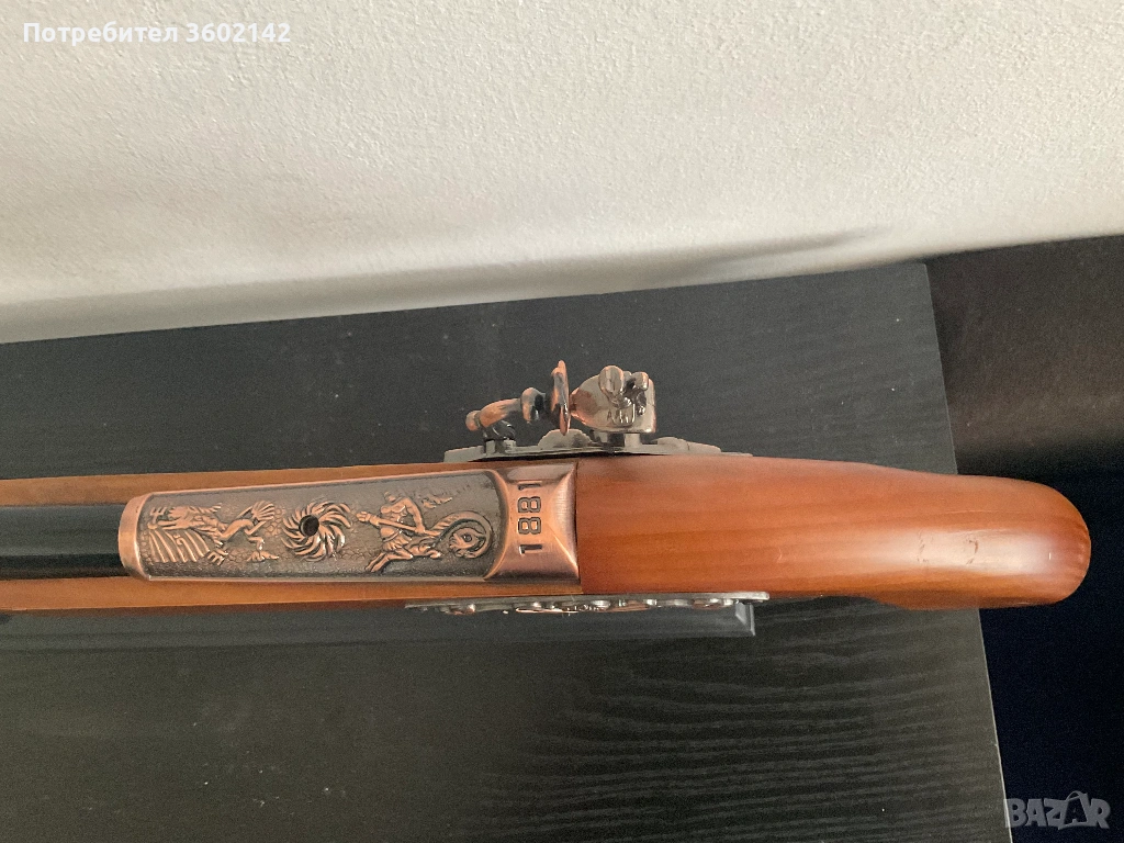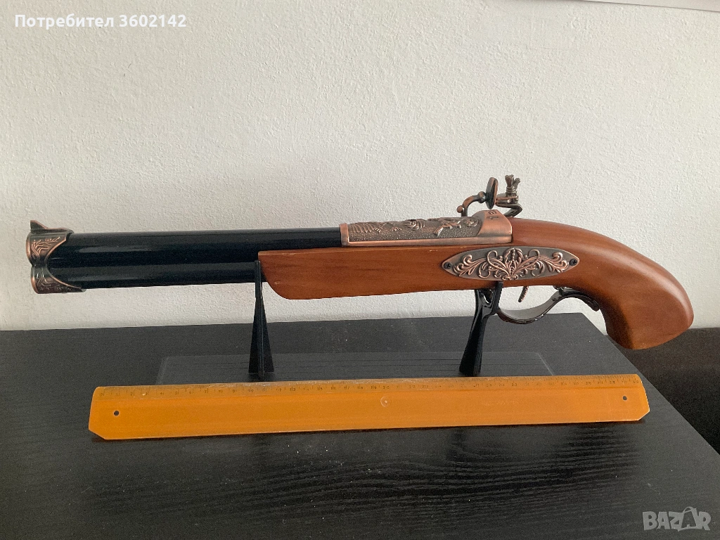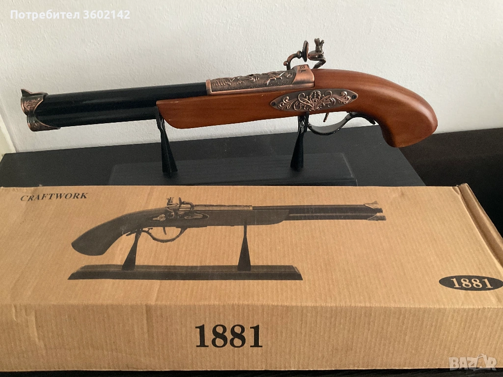 нов пистолет запалка (модел на старинен от 1881), със стойката в оригиналната опаковка. Дължина 47см. Запалката пали без проблем.