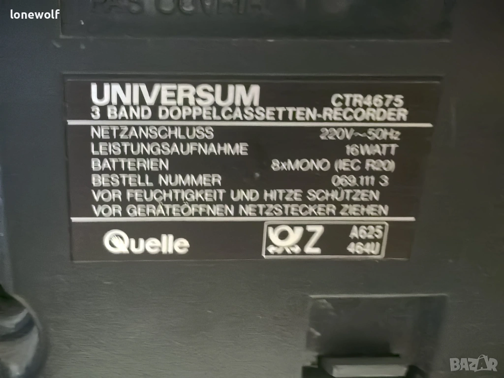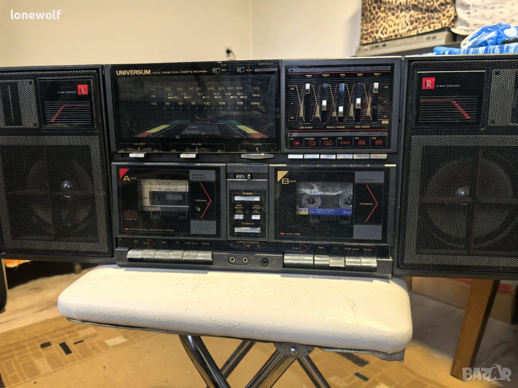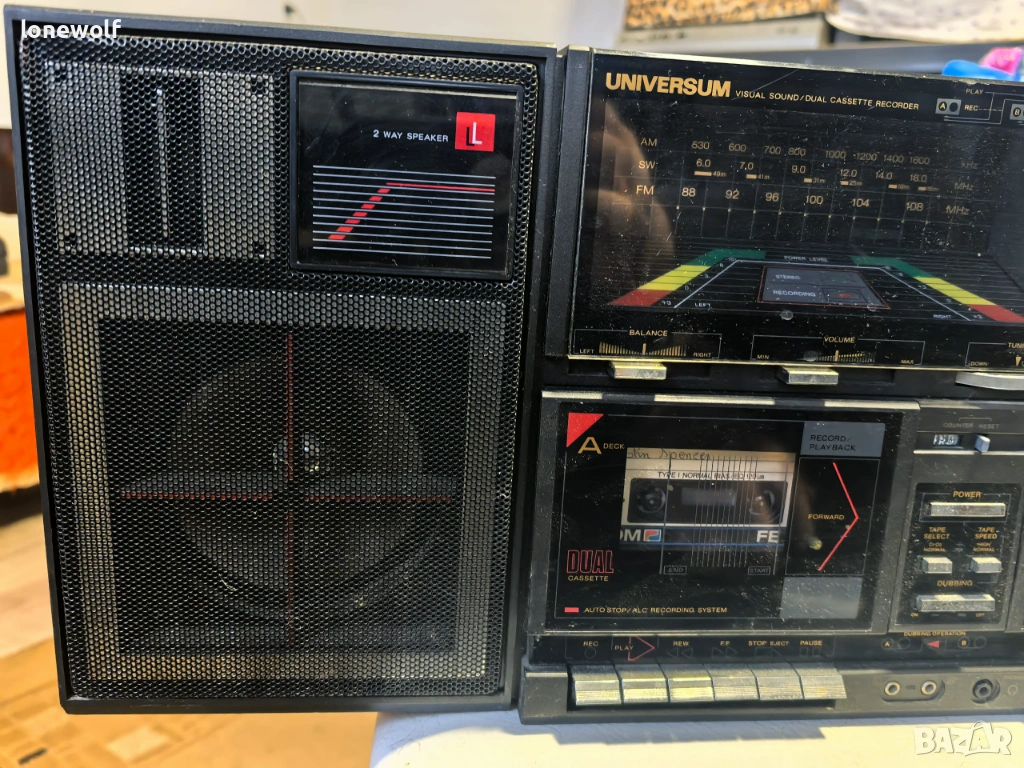 UNIVERSUM CTR 4675. Машината е със сменени ремъци, и двете гнезда работят, радиото също. Антената е оригиналната, но закопчаването е счупено. Гнездо В се чува леко по-глухо, вероятно главата иска леко пипване.... Има вход за грамофон, което е рядкост при радио касетофоните. Всички снимки са реални!!!