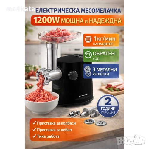 С капацитет до 1 кг/минута, функция обратен ход (Reverse) и стабилни гумени крачета против плъзгане, уредът работи сигурно и без вибрации. В комплекта са включени приставки за колбаси и кебап, което я прави идеална за домашно приготвяне на храна.