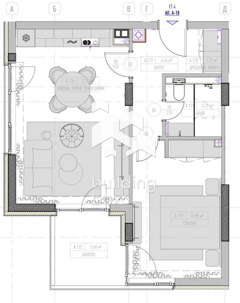 БИЛДИНГ БОКС предлага ексклузивно за продажба двустаен апартамент, разположен на 5-ти етаж от общо 6 етажа в модерна жилищна сграда в кв. Манастирски ливади Изток.
