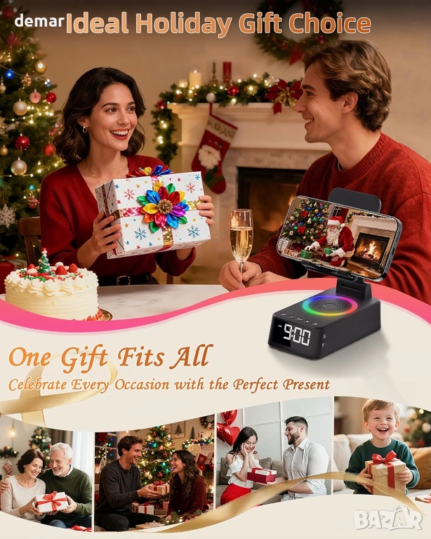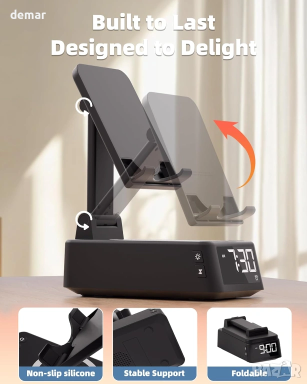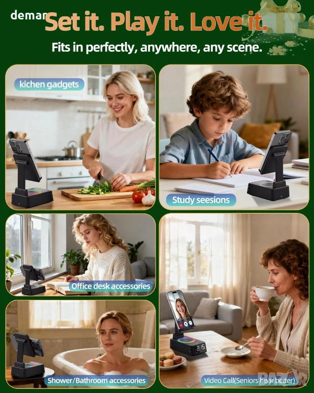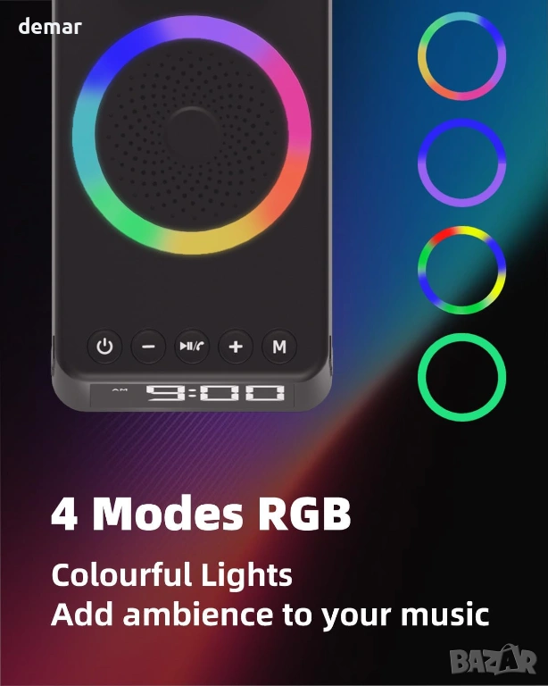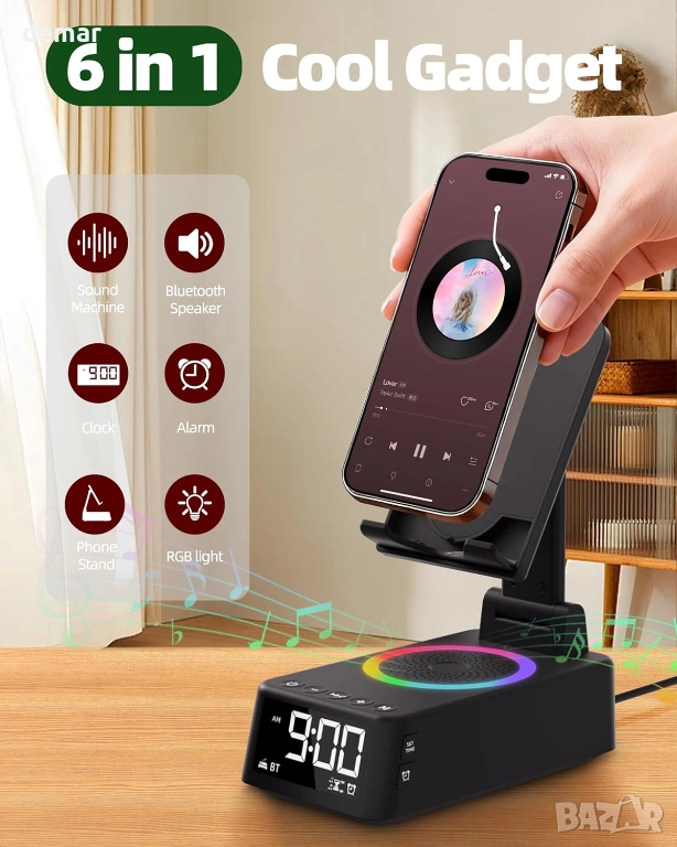 будилник, Bluetooth високоговорител, машина за бял шум, стойка за телефон, околна светлина и ясен цифров дисплей в едно компактно устройство. Разполага с дисплей с регулируема яркост в 12/24-часов формат и функция за дрямка след 9 минути за удобно събуждане. С 20 успокояващи звука без повтаряне, включително бял шум и природни ефекти, то подпомага по-добрия сън и фокус за всички възрасти. Сгъваемата, регулируема стойка за телефон позволява гледане със свободни ръце, като същевременно осигурява стерео звук чрез Bluetooth 5.4 и вграден микрофон за разговори. Включва и RGB околна светлина с множество цветови режими за допълнителна атмосфера. Леко и преносимо, то предлага до 10 часа време за възпроизвеждане, неплъзгаща се стабилност и е подходящо за употреба у дома, в офиса или при пътуване.