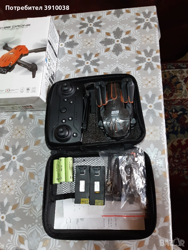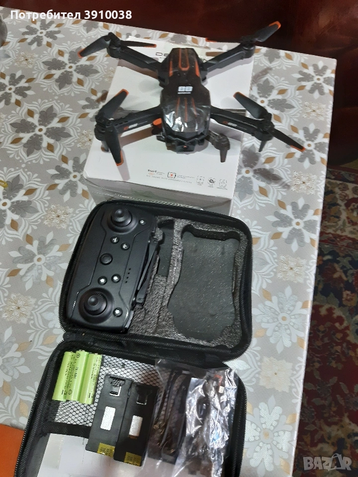 Дрона е чисто нов отворен е само за снимките две батерии за дрона и три алкални за дистанционното за повече информация позвънете на показания телефон.