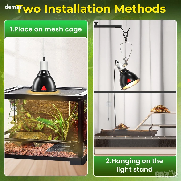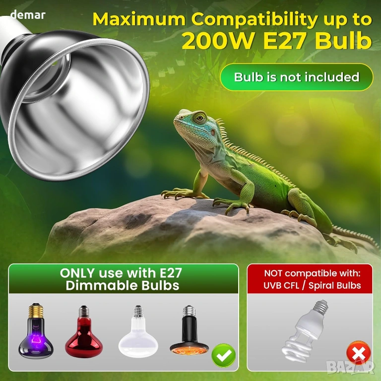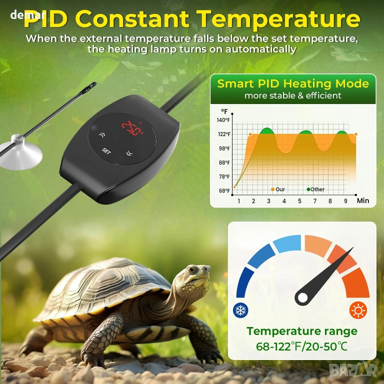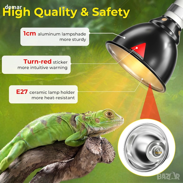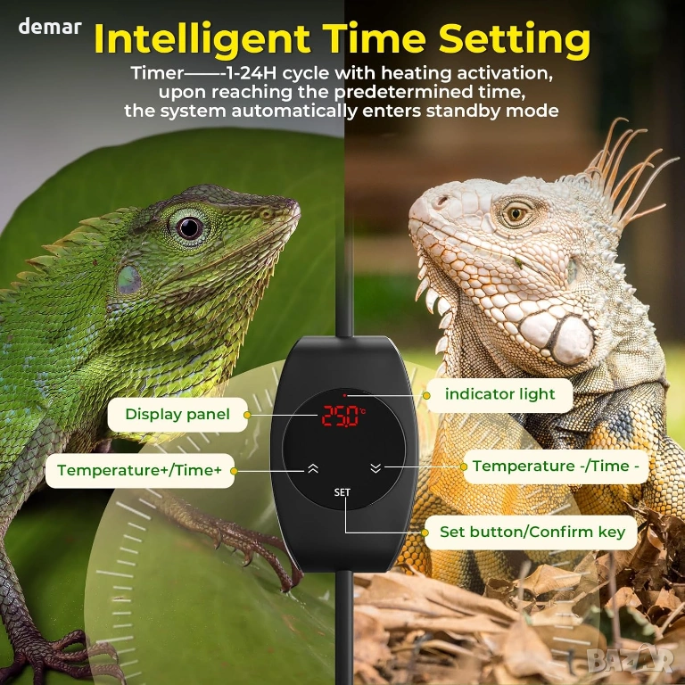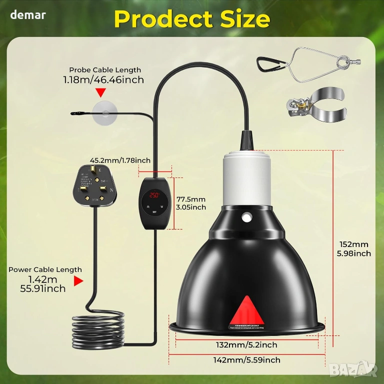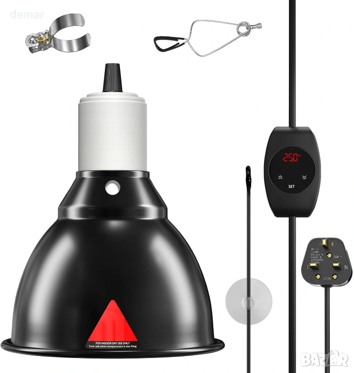 Отоплително тяло за влечуги, предназначена за видове като костенурки и брадати агами, с вграден термостат и таймер за създаване на контролирана среда за греене. Поддържа крушки E27 (до 200 W, крушката не е включена) и позволява прецизно регулиране на температурата между 20°C и 50°C с бързи контроли за настройка. Вграденият таймер позволява цикли на нагряване от 1 до 24 часа, за да симулира естествени модели на дневна светлина. Високоотражателен алуминиев абажур повишава топлинната ефективност, а индикатор за безопасност, който променя цвета си, предупреждава, когато повърхността надвиши 38°C. Лесна за инсталиране с опростен процес на настройка, тя може да се окачи или постави сигурно на повечето мрежести капаци за заграждения.