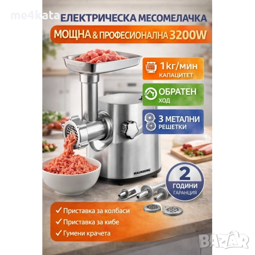 Мощна електрическа месомелачка 3200W, създадена за интензивна работа и големи количества. С изцяло метален механизъм, пълен меден мотор и алуминиева скоростна кутия, този модел осигурява висока производителност, дълъг живот и стабилна работа без натоварване.