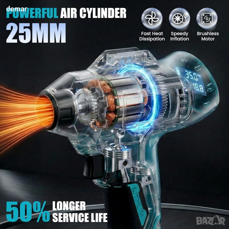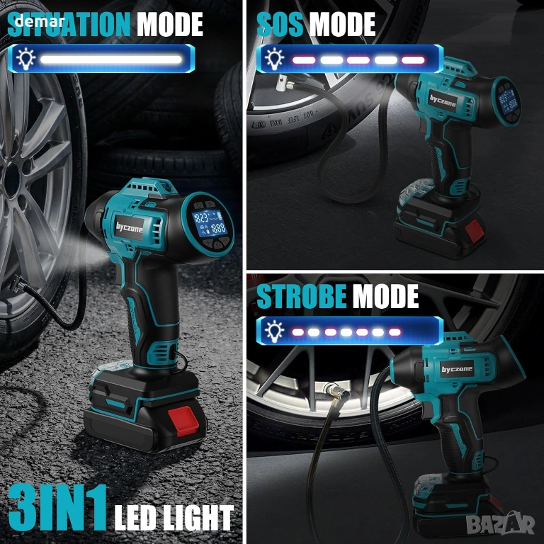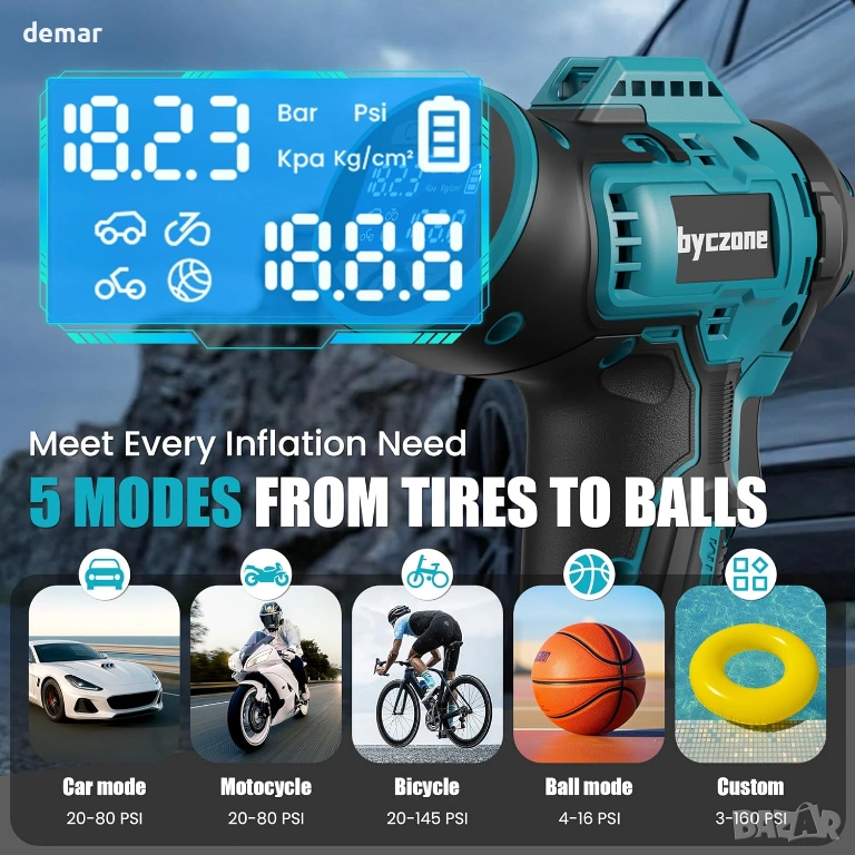 Безжична помпа за гуми, съвместима с батерии Makita 18V (батерията не е включена), предлагаща преносима и удобна употреба за различни задачи по напомпване. Осигурява до 160 PSI за бързо и ефикасно напомпване на автомобилни гуми, велосипеди, мотоциклети и спортна екипировка. Оборудвана с лесен за четене LCD цифров дисплей за точно наблюдение на налягането в реално време, заедно с функция за автоматично изключване, която спира напомпването, след като се достигне зададеното налягане, за да се предотврати пренапомпване. Подходяща за широк спектър от приложения, осигуряваща надеждна и прецизна работа на различни надуваеми предмети.