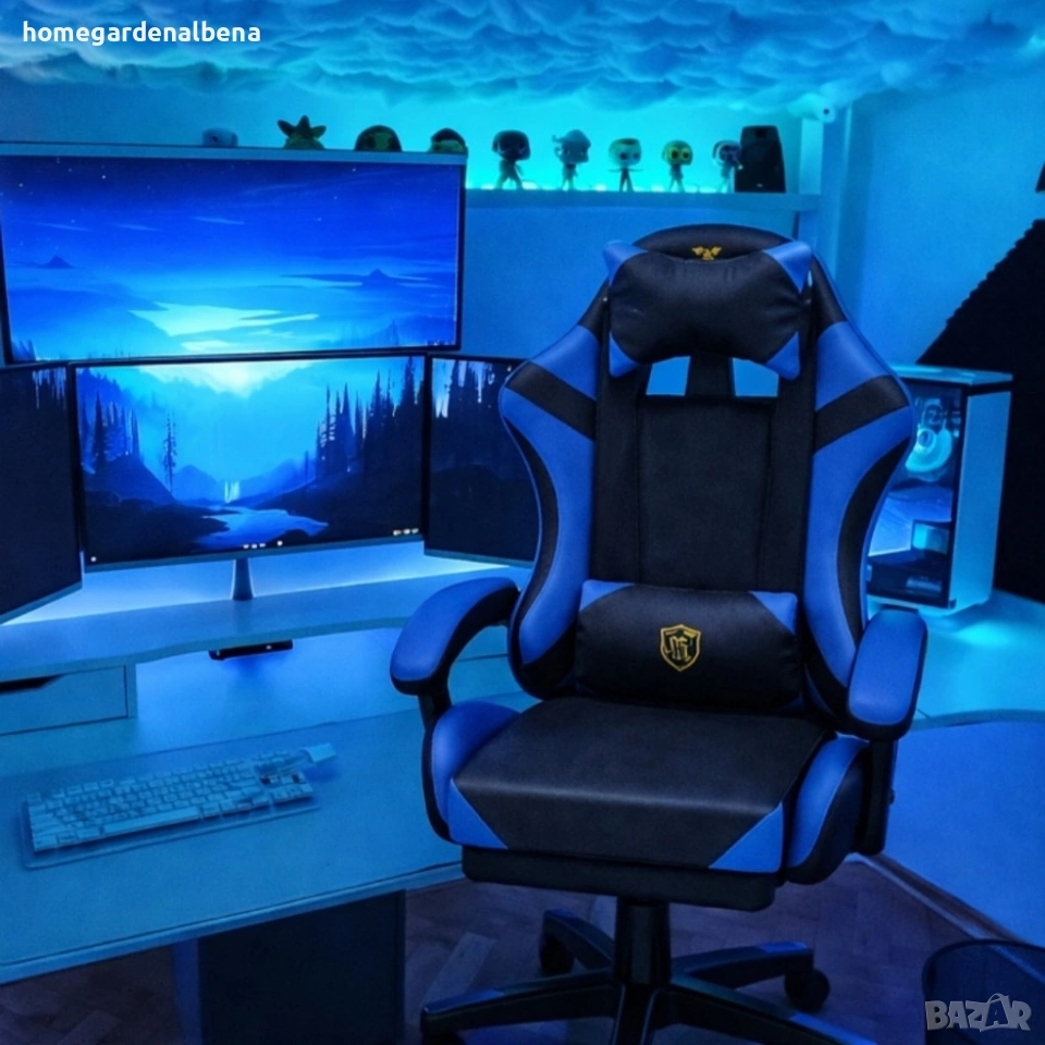 Геймърски стол с масажна функция и поставка за крака – ергономичен, черно-син