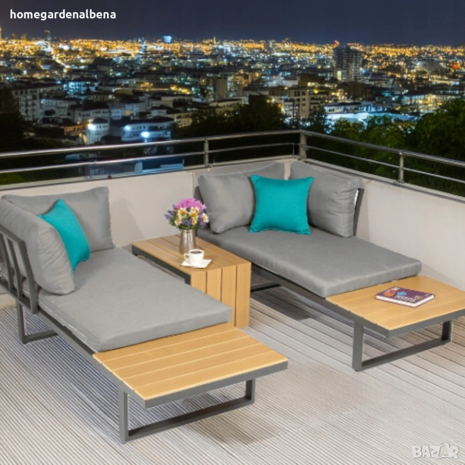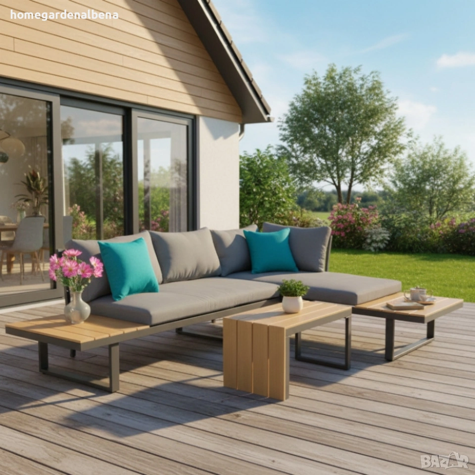 Home&Garden by Albena, градински комплект, градински мебели, ъглов диван, модулен диван, градински диван, комплект с маса, алуминиеви мебели, мебели за градина, мебели за тераса, мебели за двор, външни мебели, outdoor furniture, градински сет, модерен дизайн, сив диван, удобни възглавници, полидърво, устойчиви мебели