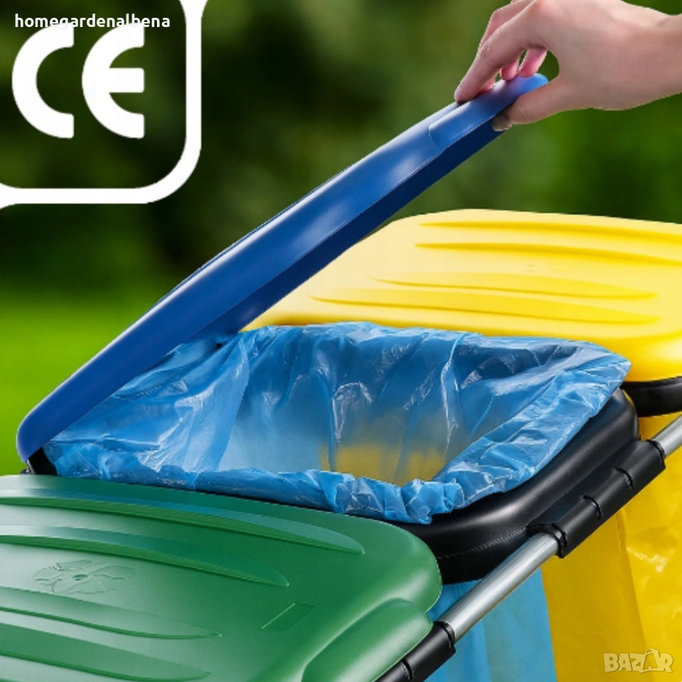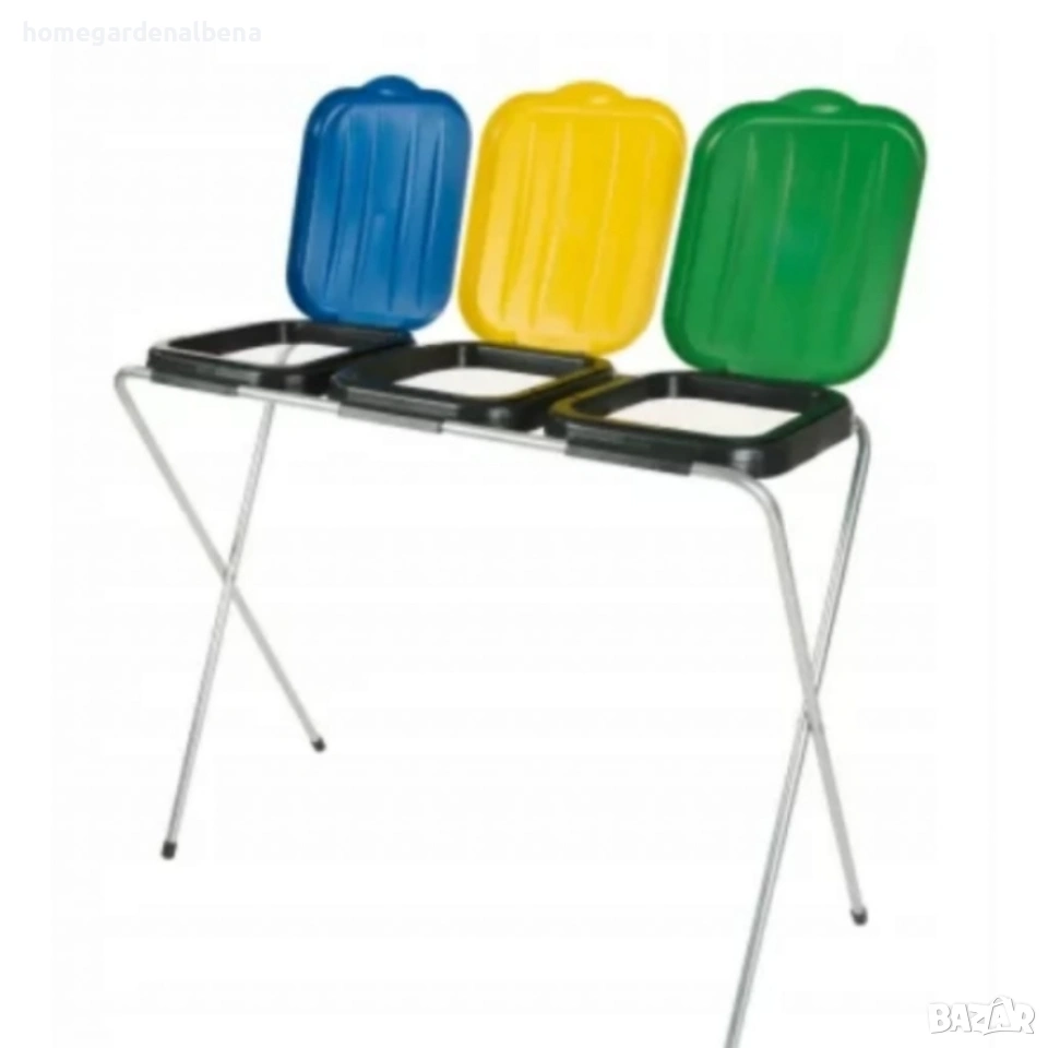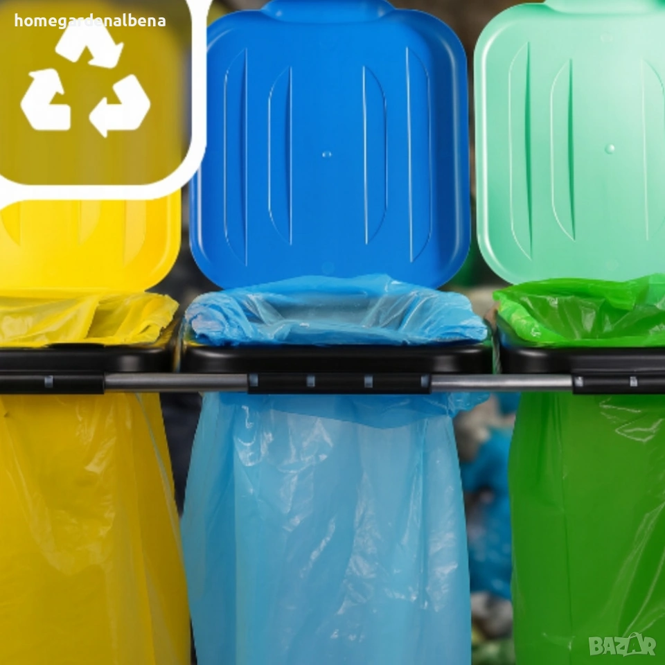 Home&Garden by Albena, стойка за отпадъци, разделно събиране, кош за боклук, кош за разделно събиране, рециклиране, еко кош, 3 отделения, цветни капаци, метална стойка, кош за пластмаса, кош за хартия, кош за стъкло, градина, двор, офис, екологичен продукт, recycling bin, waste sorting, кош 120 литра