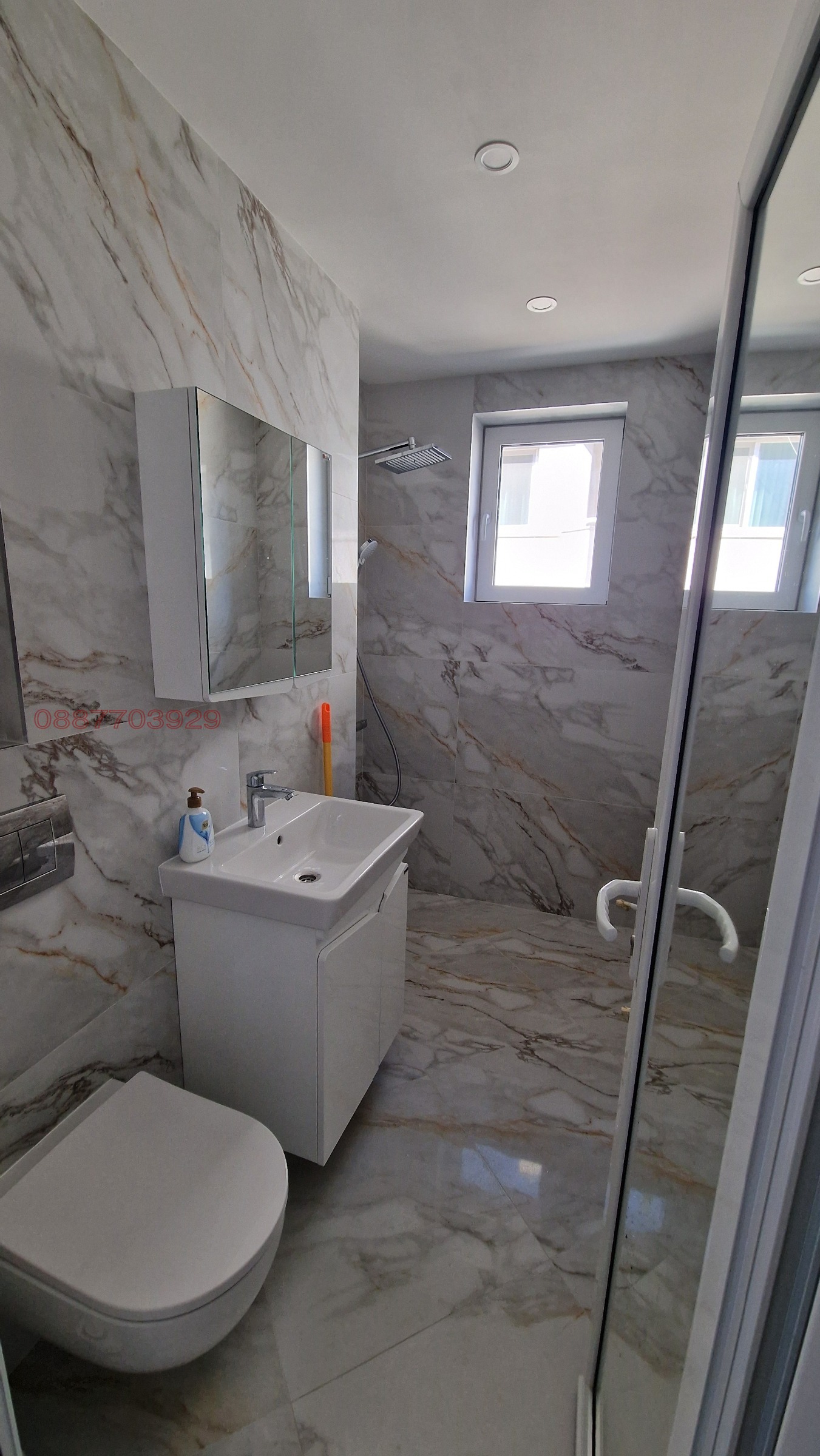 Банята разполага с прозорец за естествена вентилация, осигуряващ допълнителен комфорт, а тоалетната е изпълнена с вградена структура и съвременен дизайн.
