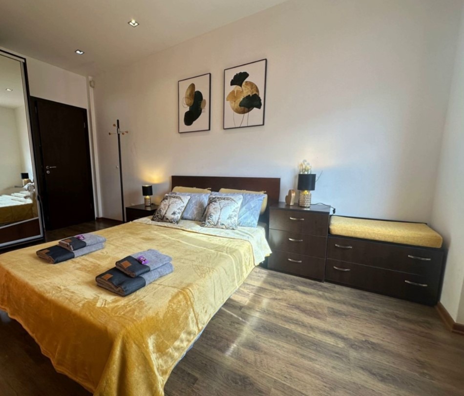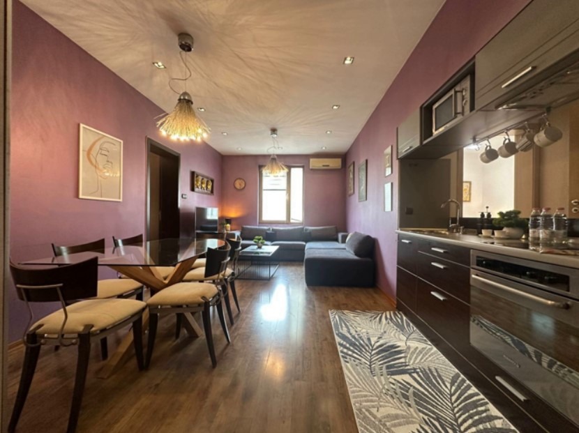 Имотът е обзаведен, с площ 95 кв.м, на 6-ти от 6 етажа в сграда с асансьор. Разпределението включва входно антре, хол с кухненски бокс и трапезария, две спални, две бани с тоалетна и тераса.