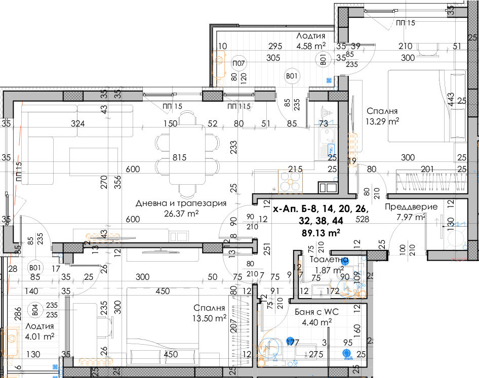 Стаите са функционално разпределени по следния начин - просторна и слънчева дневна с кухненски бокс, ДВЕ спални, входно антре, баня с тоалетна, тоалетна, две тераси.
