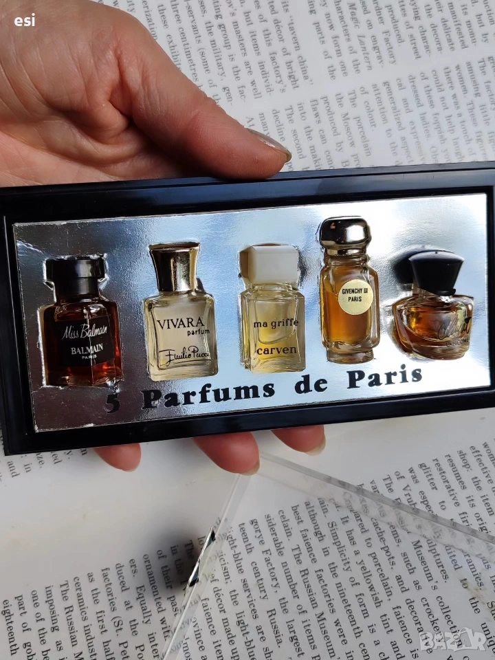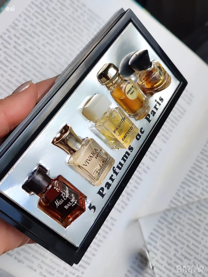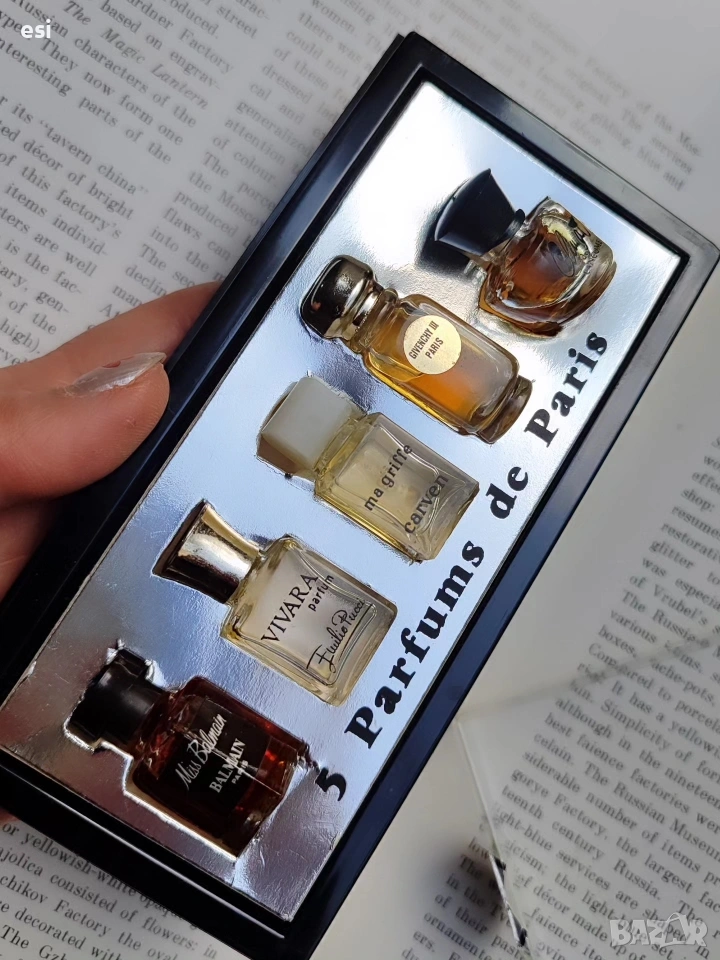 Винтидж комплект мини френски парфюми "5 Parfums de Paris"(около 80-те години). Изключително рядък колекционерски комплект,съдържащ пет емблематични френски аромата в техните оригинални миниатюрни бутилки реплики. Miss Balmain (Balmain) Givenchy III (Givenchy) Antilope (Weil) Vivara (Emilio Pucci) - ❌за съжаление шишенцето е празно Ma Griffe (Carven) Цена 40 €
