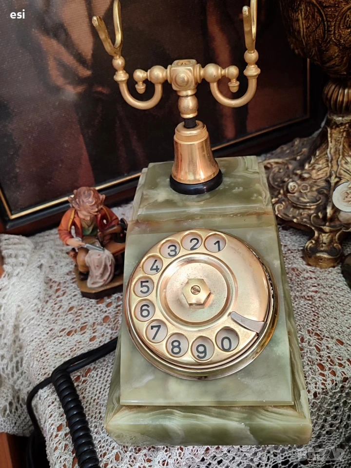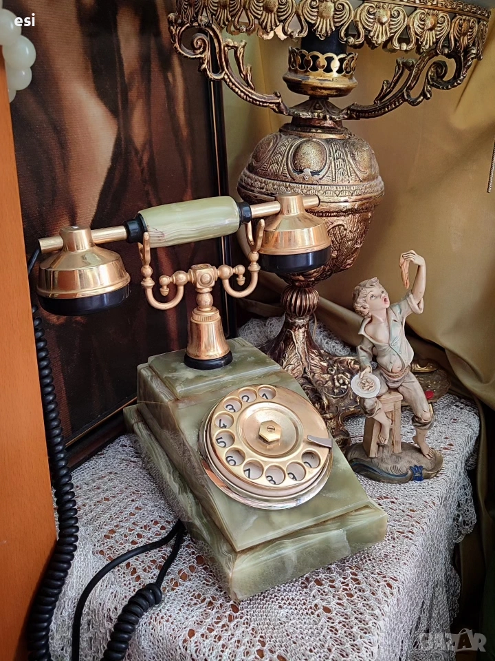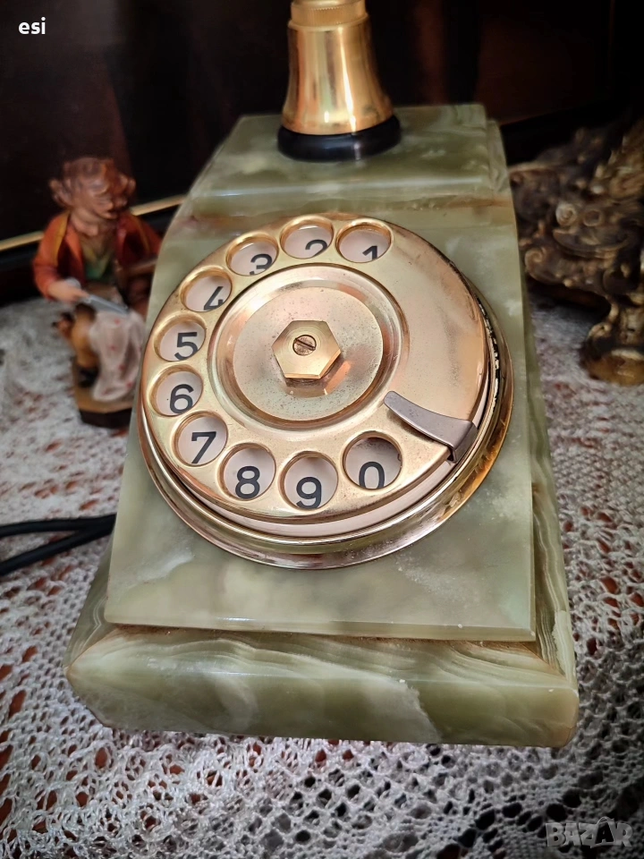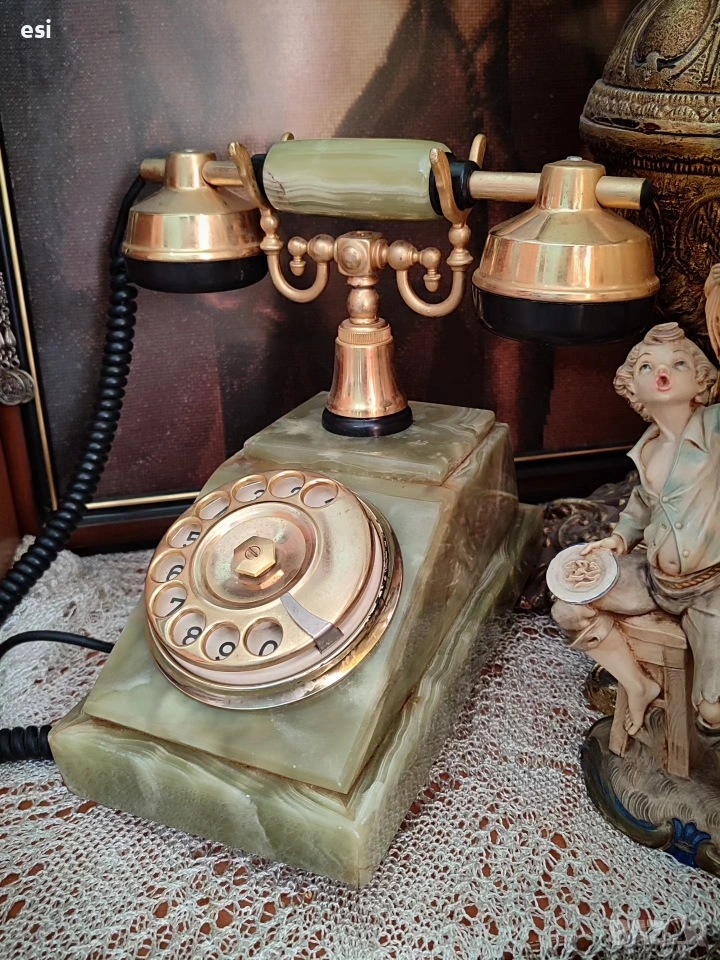 Античен ротационен телефон, изработен от естествен оникс и месингови детайли. Материали: Основата и дръжката на слушалката са изработени от масивен оникс (често в зелени или медени нюанси), а металните части от месинг Произход: Италия от 70-те години Цена 100 €