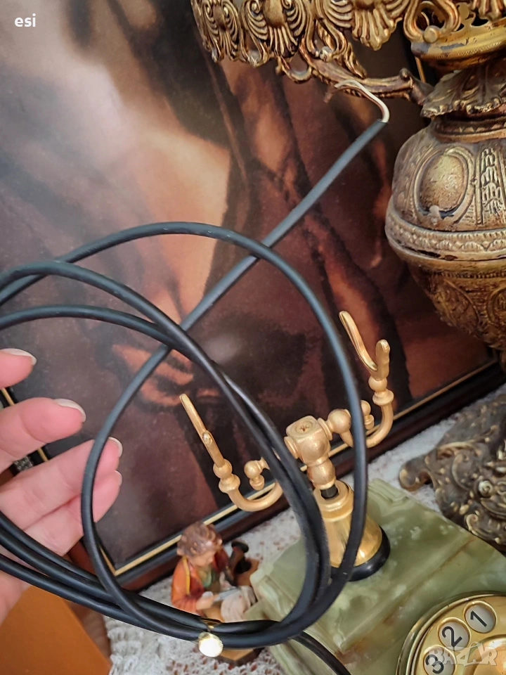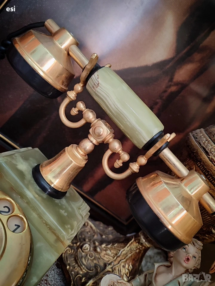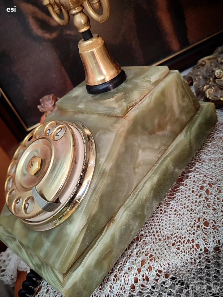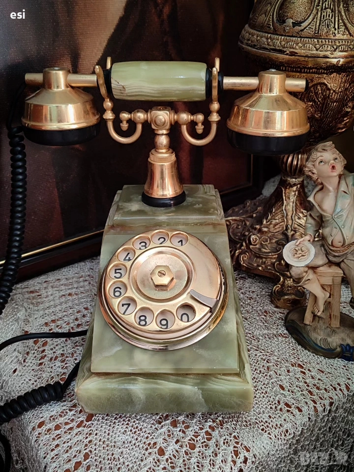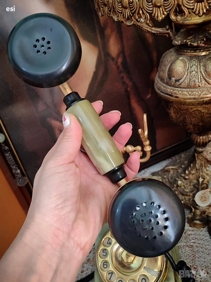 Античен ротационен телефон, изработен от естествен оникс и месингови детайли. Материали: Основата и дръжката на слушалката са изработени от масивен оникс (често в зелени или медени нюанси), а металните части от месинг Произход: Италия от 70-те години Цена 100 €