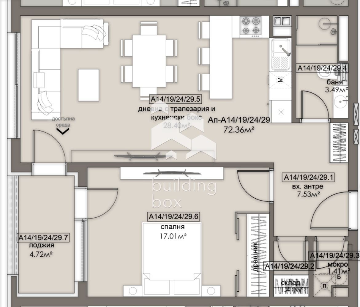 БИЛДИНГ БОКС представя сграда, която се отличава с просторни жилища с перфектно разпределение, нисък процент общи части и високо качество на строителството, изпълнено от опитни професионалисти, които осигуряват сигурност и комфорт за бъдещите обитатели.