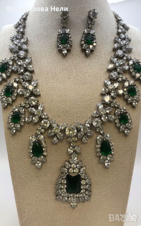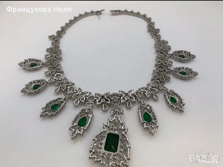 Старинно колие и обеци Арт Деко , изработени от сребро 925 с шлифовани смарагдии и кристали