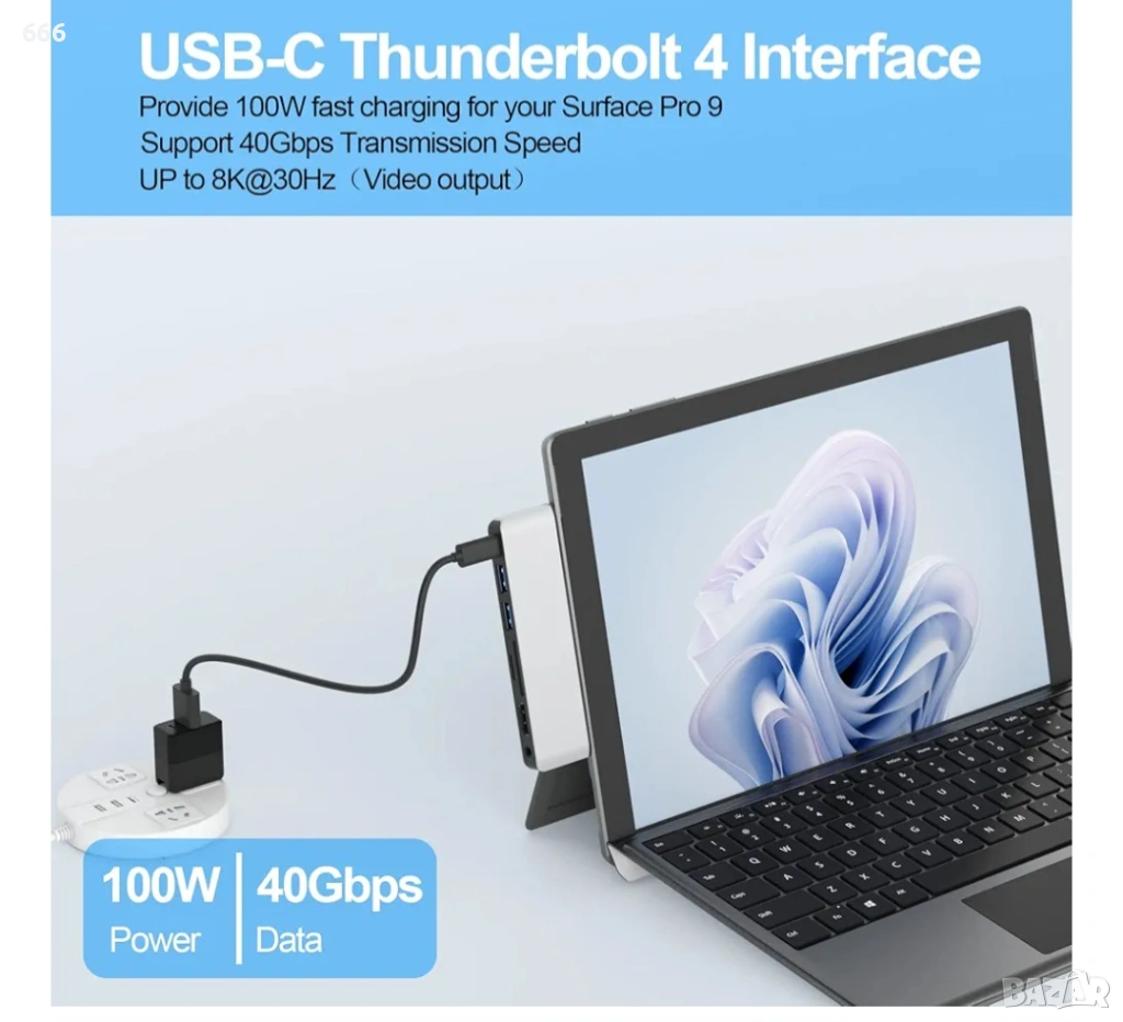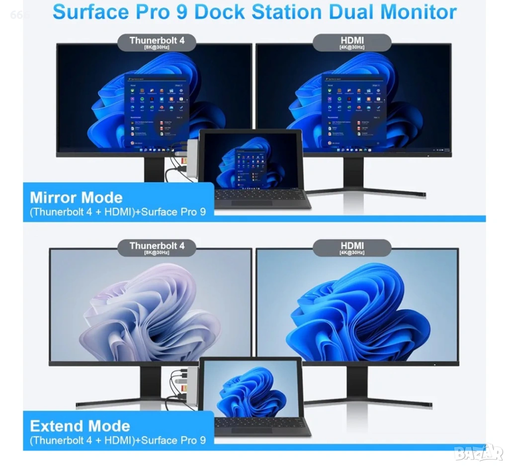 Докинг станция Surface Pro 9 с троен дисплей: Троен дисплей (Ultra HD 4K HDMI + USB-C Thunderbolt 4) + режими на Surface Pro 9. Увеличете ефективността си 3 пъти. Поддържа до 4k@30Hz дисплеи с HDMI порт или 8K@30Hz дисплеи с USB-C Thunderbolt 4 порт. Показва задачи с Ultra HD изображения за дизайн на илюстрации и видео редактиране. С този разделен дисплей на Surface Pro 9 USB C хъб, се насладете на по-рязък двоен екран (HDMI 4K@30Hz и USB-C Thunderbolt 4 8K@30Hz). Поддържа режим на разширяващ се или огледален режим.