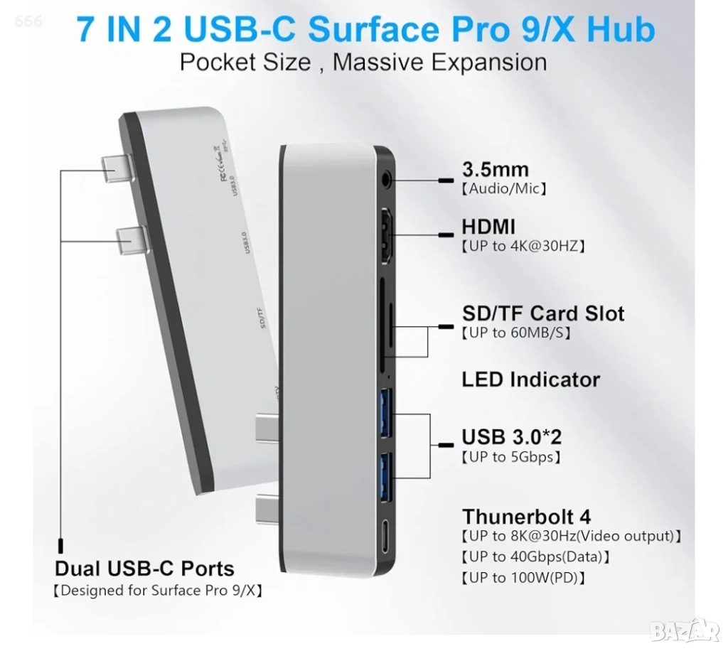 Дизайн 7-в-2 Hub за Surface Pro 9/10/11: Превръща 2 USB-C конектора в 7 порта (HDMI 4K/30Hz, USB C порт*1, USB-A 3.0*2, четец на SD карти*1, четец на Micro SD(TF) карти*1, 3.5 мм аудио*1). Забележка 1: Този адаптер за Surface Pro 9 няма да пасне добре на вашата повърхност, ако използвате защитен калъф. Съвместим само с Microsoft Surface Pro 11/Pro 10/Pro 9/Pro X. Забележка 2: Несъвместим със Surface Go/Surface Pro 3,4, 5, 6,7,8.
