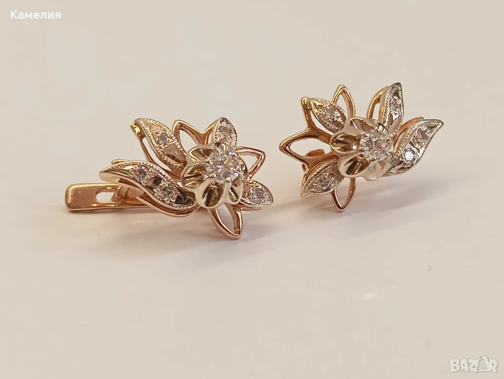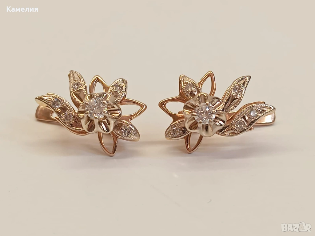 Много красив руски златни масивни обеци с брилианти. Проба 585 глава с кокошник. Грамаж 5,57 грам. Бр57-0,35сt. Централни брилианти по 3 мм.