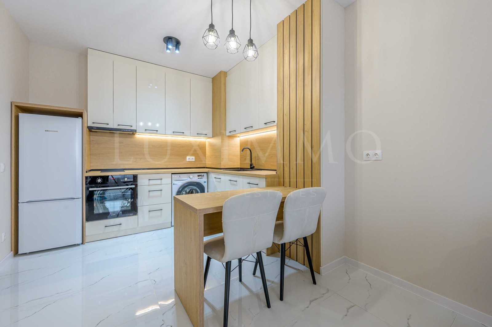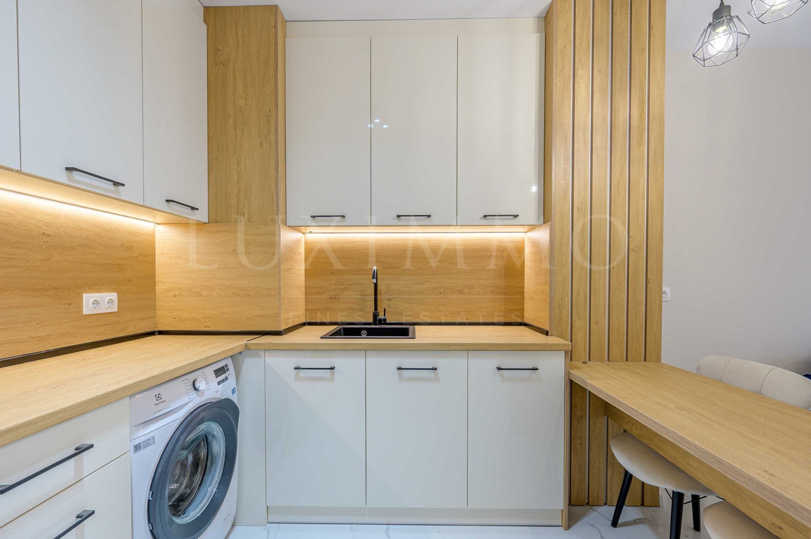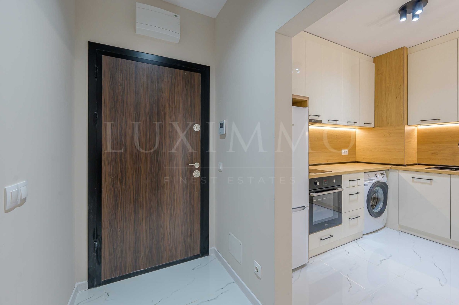 - Кухня, оборудвана с хладилник, фурна с котлони и пералня