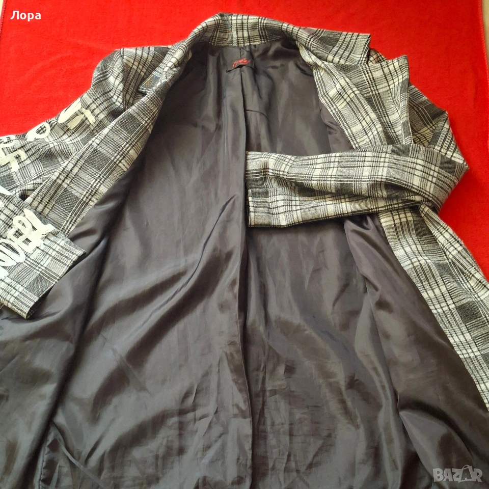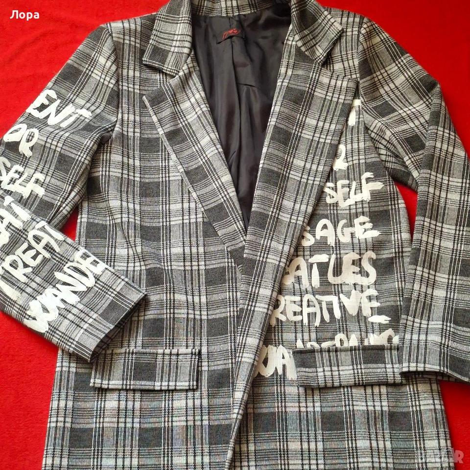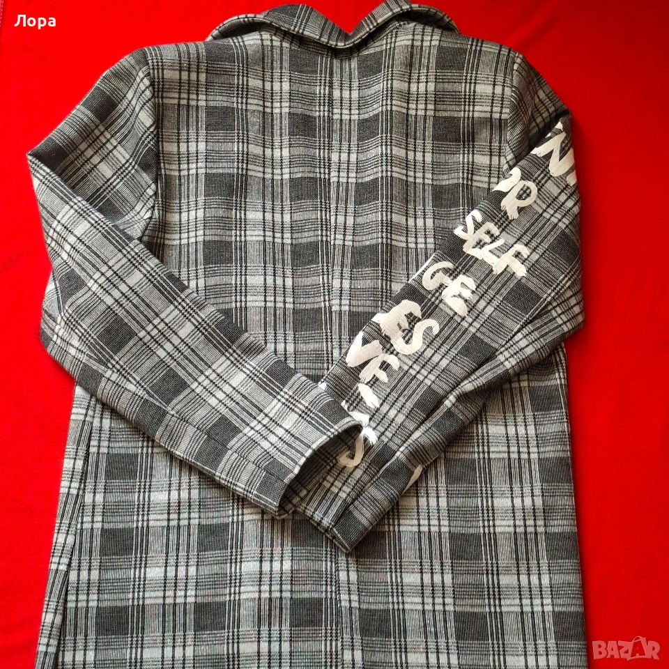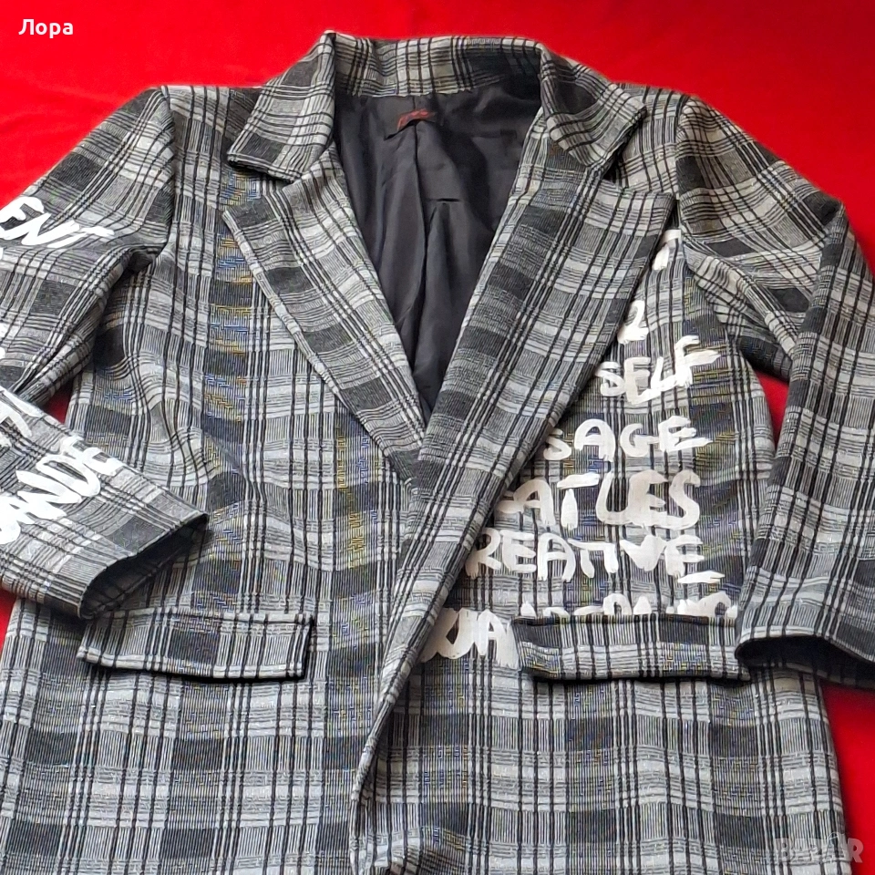 Ново дамско сако без етикет. Сакото е с подплата. Материята на лицевата част има еластичност. Цветовете са сиво и черно със сребърна нишка. Размери ширина от рамо до рамо 44 см. от мишница до мишница 49 см. дължина на ръкава 57 см. талия 49 см. дължина на сакото 77 см. Без закопчаване. Стои свободно. Подходящо за пролет и есен. Изпращам по Еконт с опция преглед и тест.