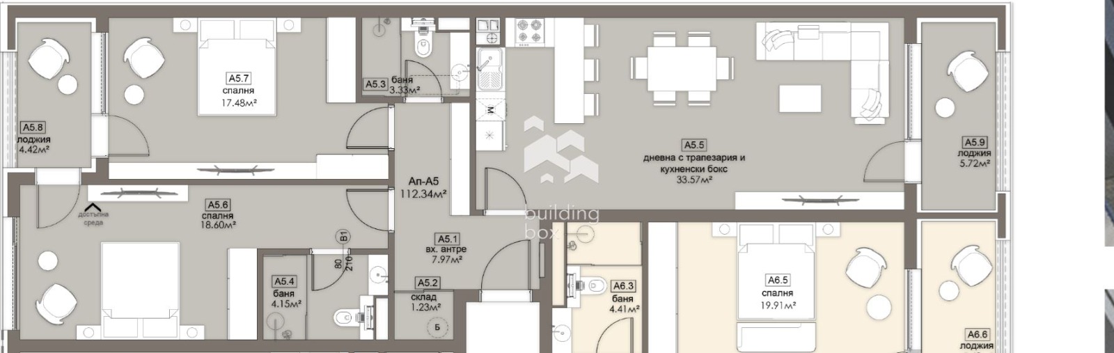 БИЛДИНГ БОКС представя сграда, която се отличава с просторни жилища с перфектно разпределение, нисък процент общи части и високо качество на строителството, изпълнено от опитни професионалисти, които осигуряват сигурност и комфорт за бъдещите обитатели.