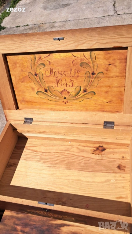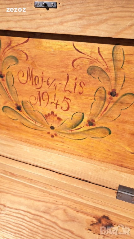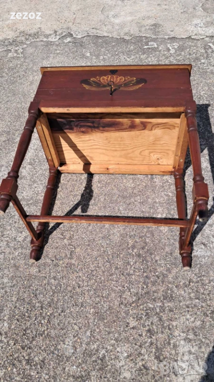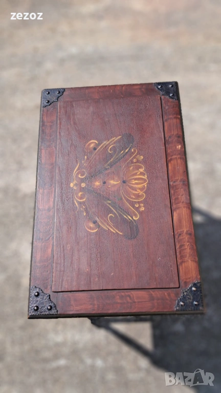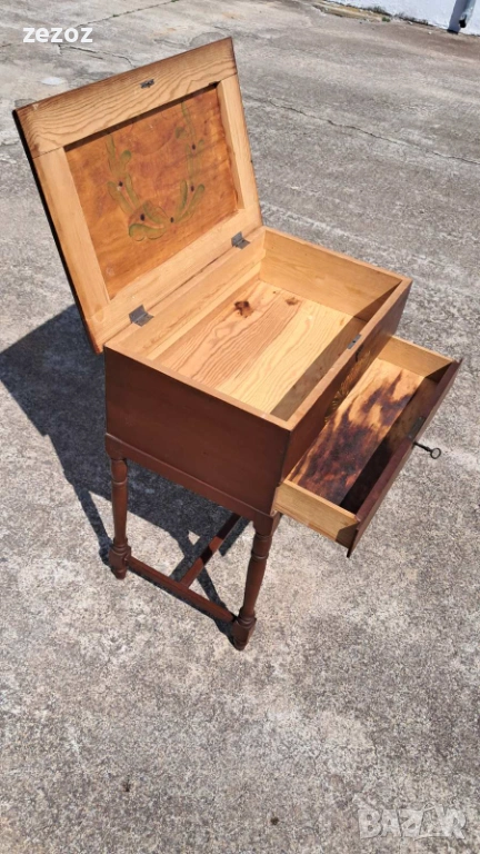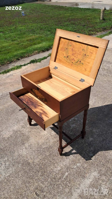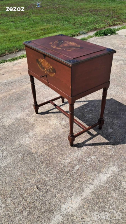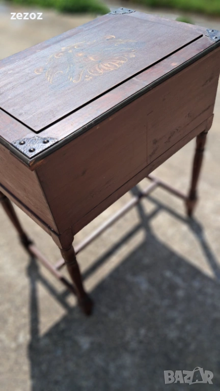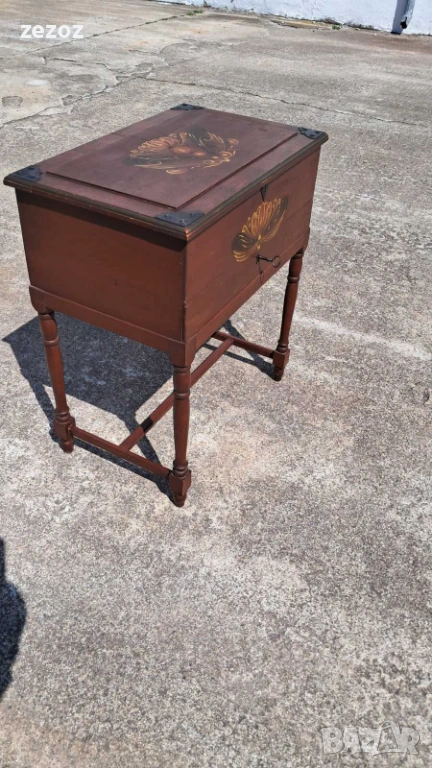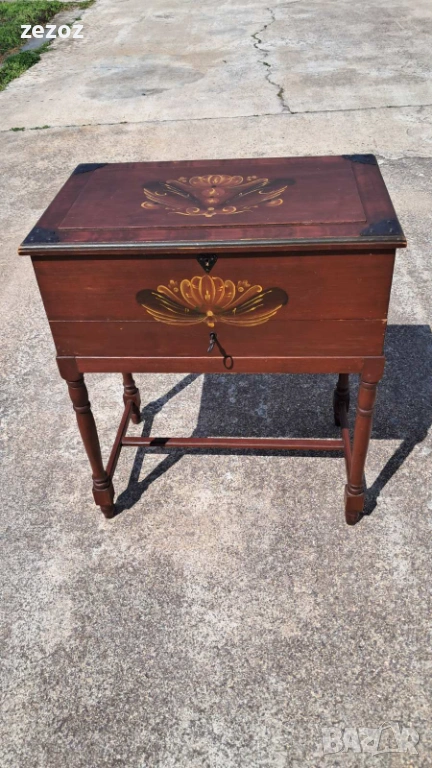 Ретро кутия на крака,произведена в Швеция.Това са така наречените"Масички за шиене" от средата на 20 век.Изработена от масив със струговани крака.Характерната за Швеция живопис "KURBITS".Ръчно рисувана с маслени бои и упомената година и месец-Май,Юни 1945 г.Капака се отваря и разкрива пространство за съхранение.Метални орнаменти по ъглите.Липсва ключето за чекмеджето.Размери-