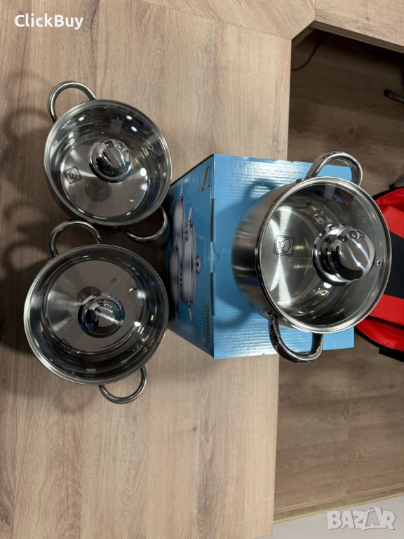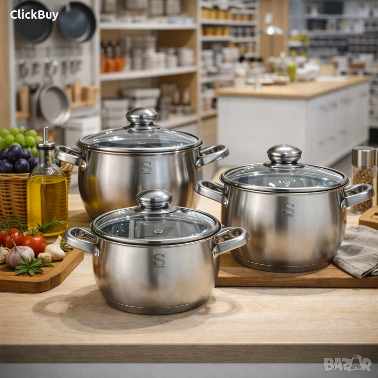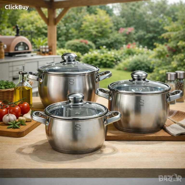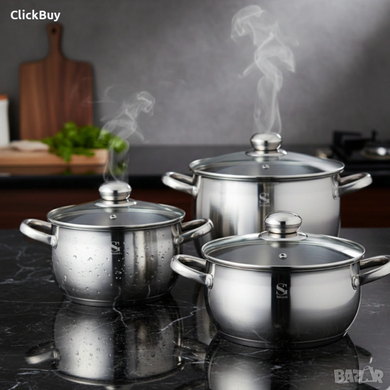 Продавам висок клас комплект тенджери, изработени от висококачествена неръждаема стомана. Комплектът е проектиран за максимална ефективност и дълготрайност в кухнята.