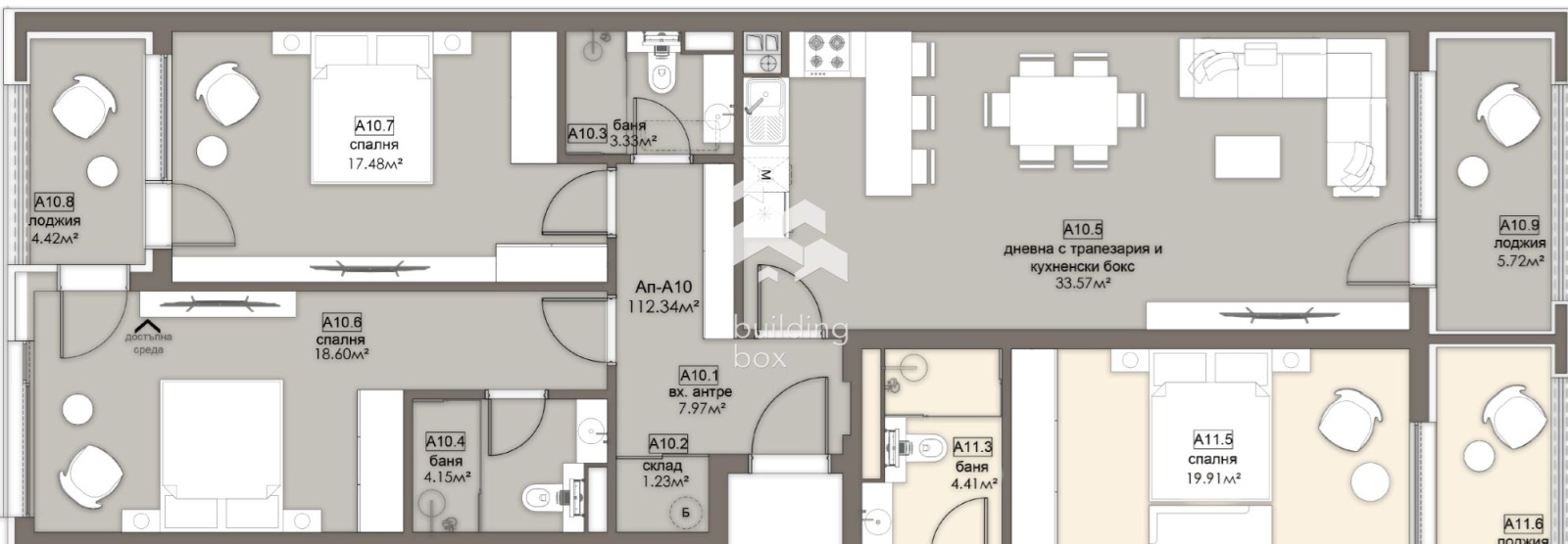 БИЛДИНГ БОКС представя сграда, която се отличава с просторни жилища с перфектно разпределение, нисък процент общи части и високо качество на строителството, изпълнено от опитни професионалисти, които осигуряват сигурност и комфорт за бъдещите обитатели.