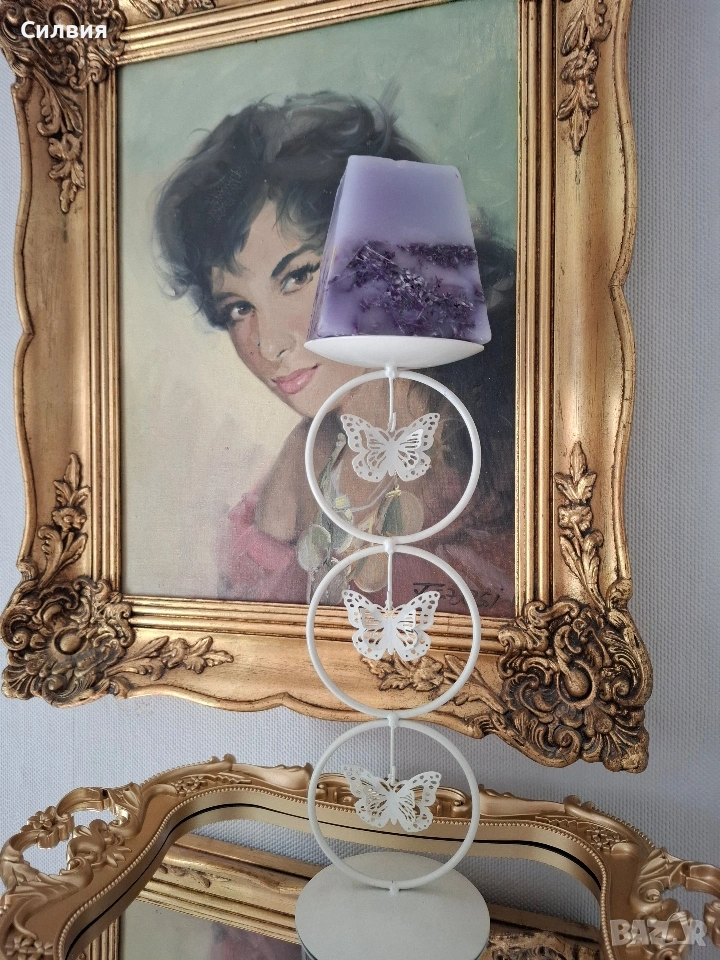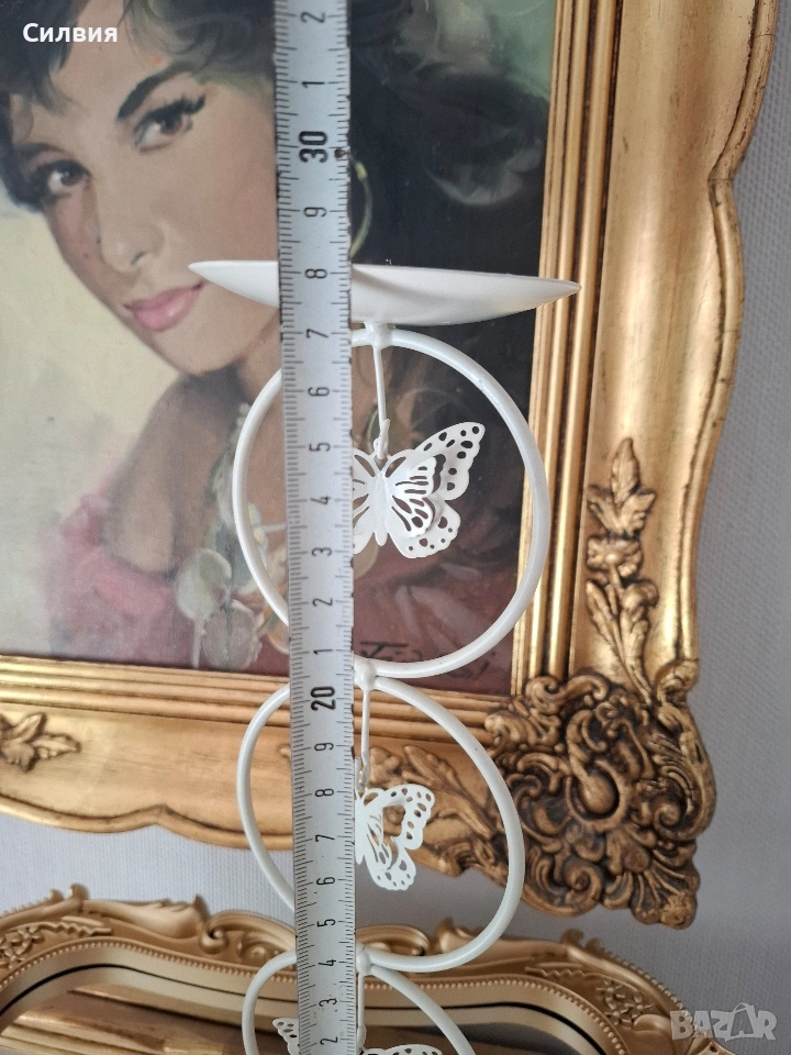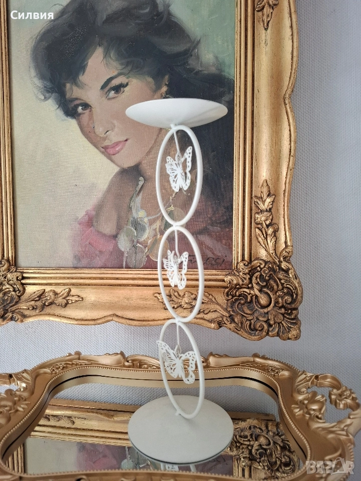 Елегантен Свещник „Нежност“ – Пеперуди в Ретро Стил Търсите ли акцент, който да внесе уют и щипка магия в дома ви? Този метален свещник е перфектното допълнение за вашия интериор. Дизайн: Изчистен млечно бял цвят с три деликатни пеперуди, разположени в ефирни метални кръгове. Височина: 28 см – идеалният размер за трапезна маса, камина или нощно шкафче. Материал: Здрав метал с матово покритие, съчетаващ издръжливост и лекота. Атмосфера: Създава усещане за спокойствие и романтика. Изглежда чудесно както в модерна обстановка, така и сред антикварни мебели и златни орнаменти. Защо да го изберете? Този свещник не е просто предмет, а малко произведение на изкуството. Пеперудите сякаш „левитират“ във въздуха, а меката светлина на свещта ще създаде красиви сенки във вашето кътче за релакс. Това е винтидж артикул и няма да е в чисто ново състояние. Възможно е да има малки несъвършенства, които само допълват историята на артикула. Цена 1️⃣8️⃣€《35,21лв 》