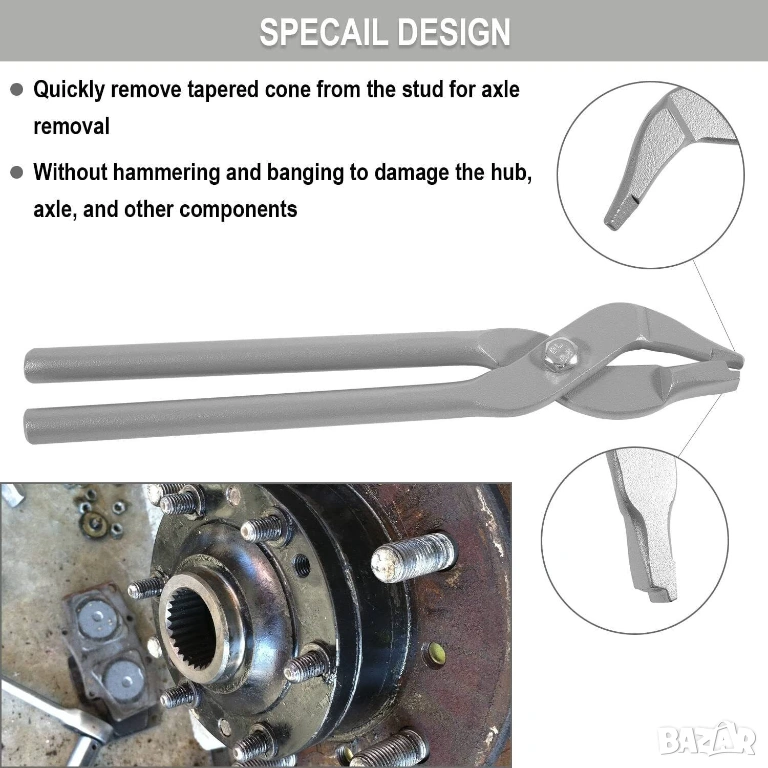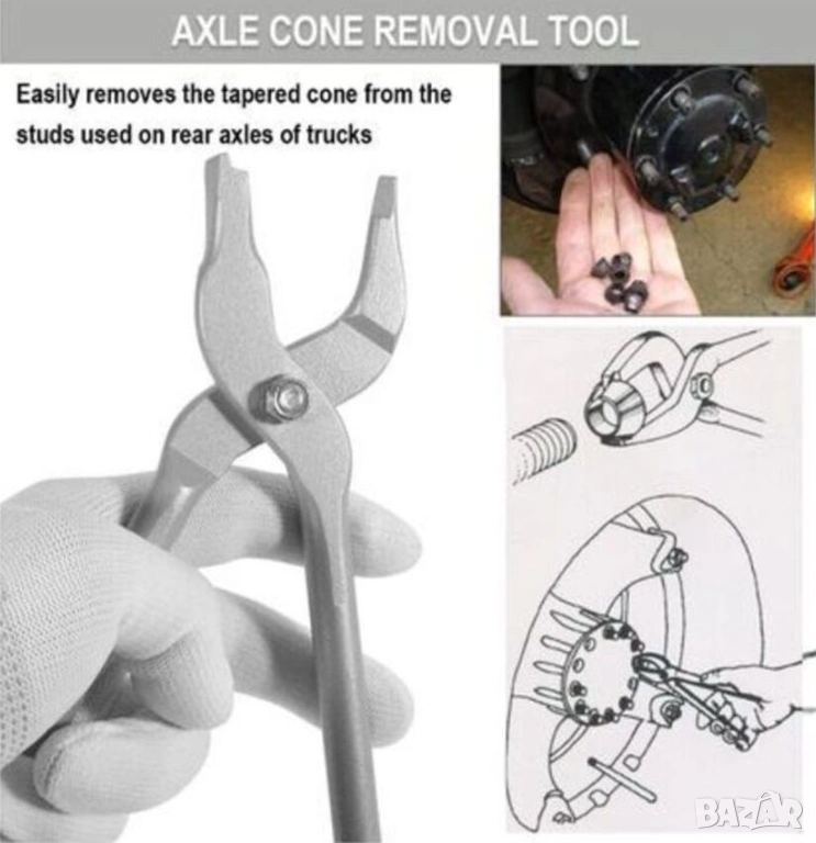 Класически ръчни инструменти със здравина и надеждност за многогодишна употреба - клещи специализирани за вадене на конусните втулки центроващи върху шпилките на главините на преден и заден мост на разни модели джип, пикап, пътнически (автобуси), лекотоварни (ван бус) и товарни (камиони) при ремонт на автомобили в работилница, гараж, автосервиз и др. (вижте снимки).