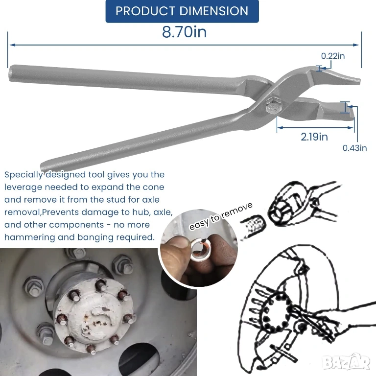 • АРТИКУЛ: Професионални КЛЕЩИ Скоба за отваряне демонтаж на Конусни Втулки на Главини на Задвижващи Предни и Задни Мостове; (Axle Stud Cone Plier for manual and auto Front and Rear Wheel Hubs on 4x4, SUVs, Pickups, Light, Medium and Heavy-duty Trucks American-made Product NOS);