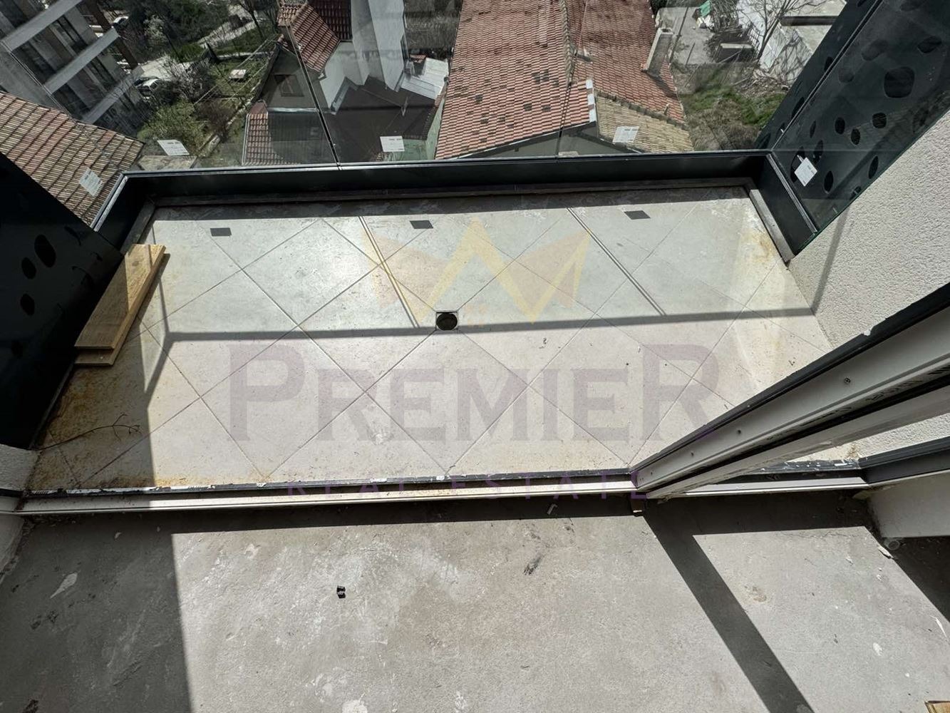 Разпределението на имота е следното: Прекрасна дневна с кухненска част 40кв.м с френски прозорци с излаз на тераса от която се открива прекрасна панорама, две спални по 18 кв и 14.4 кв, баня с тоалет , отделно тоалет. Апартаментът е с правилни форми, идеален избор за семейно жилище.