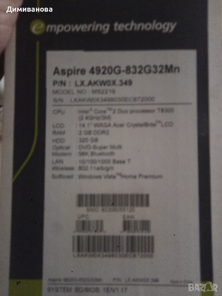 Acer 4920G за части или ремонт → Обява 54121579