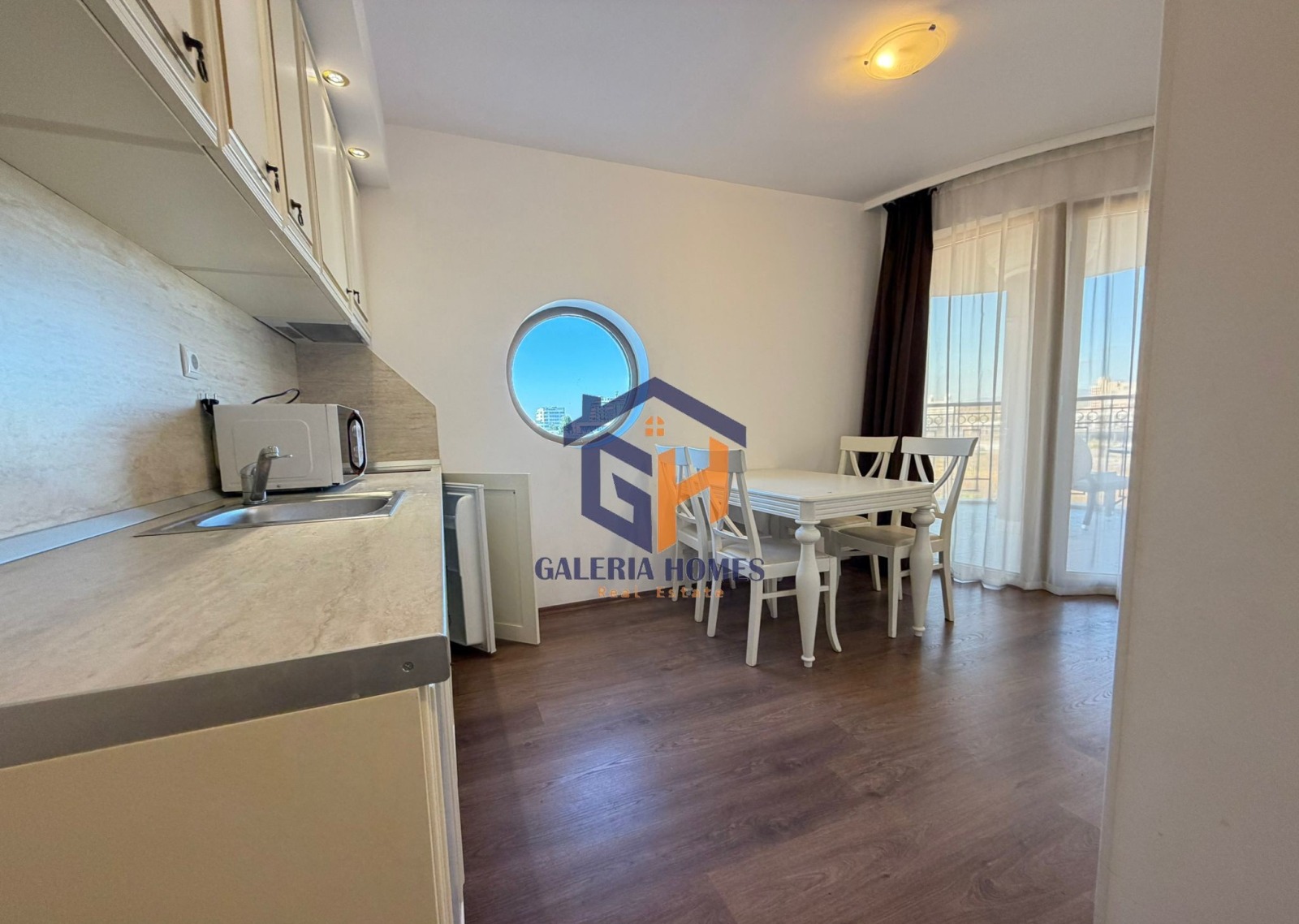 Имотът се състои от: антре, всекидневна с кухненски бокс, две спални, баня с тоалетна и тераса с Невероятна Гледка Море.