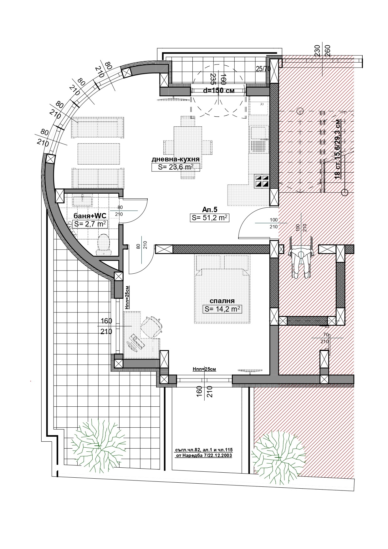 АПАРТАМЕНТ 5 на четвърти архитектурен етаж, кота + 9,00 , със застроена площ 51,10 кв.м., състоящ се от: дневна с кухня, спалня, баня с тоалетна, тераси и балкон, заедно с изба 5 с площ 11,60 кв.м. , ведно с 5,964 % ид.ч. от общите части на сградата, както и 12,70 кв.м. от прилежащия терен.