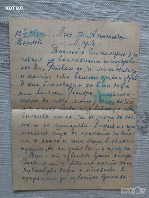 Има и една кореспонденция между / 12 III 953 г. Търхово Люб. бр. Александър / Л. С. Б. до Брат Стамат..