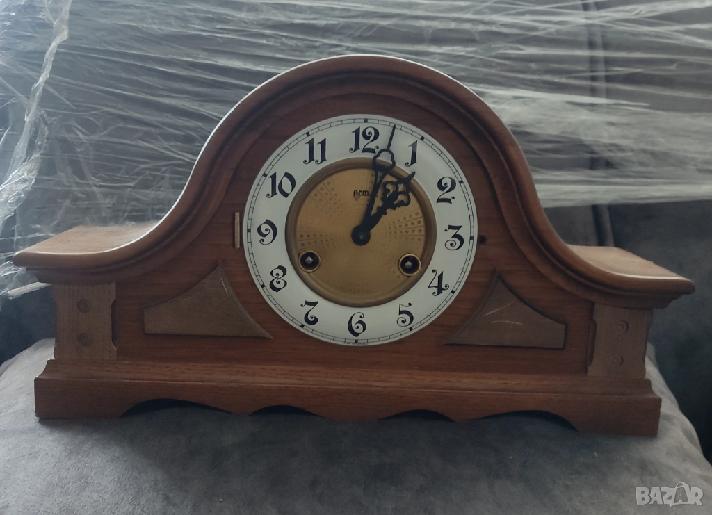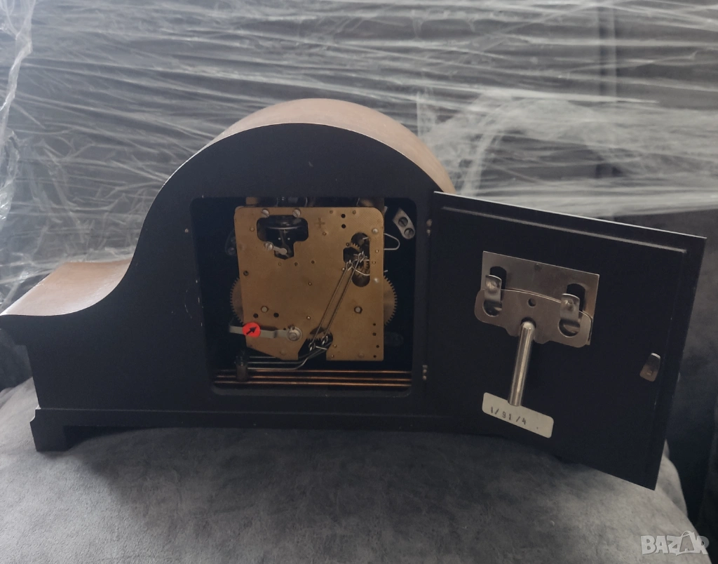 Колекционерски каминен часовник Franz Hermle 340-020. Произведен в Германия средата на 20-ти век. Механичен, 8-дневен с балансово колело (без махало). Уестминстърски звън на всеки 15 минути и отчитане на кръгъл час.