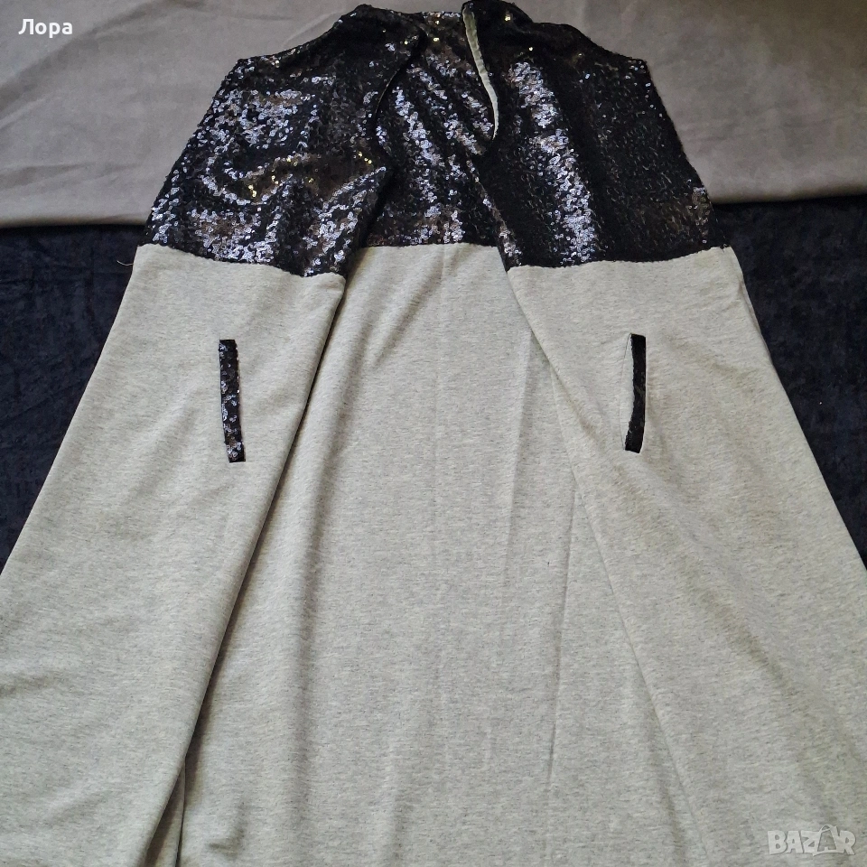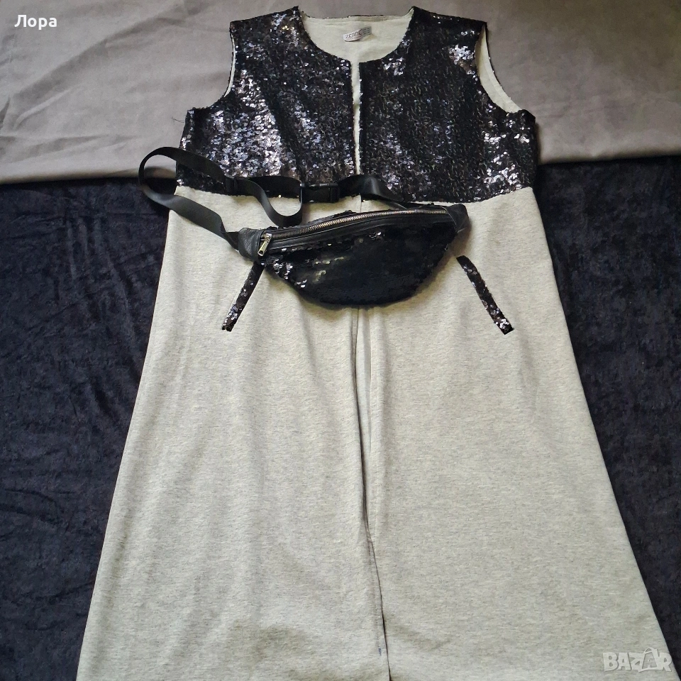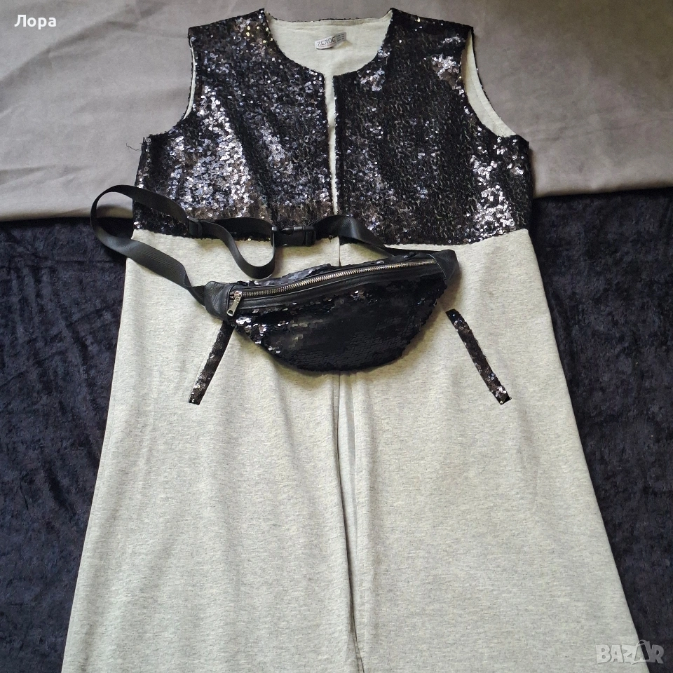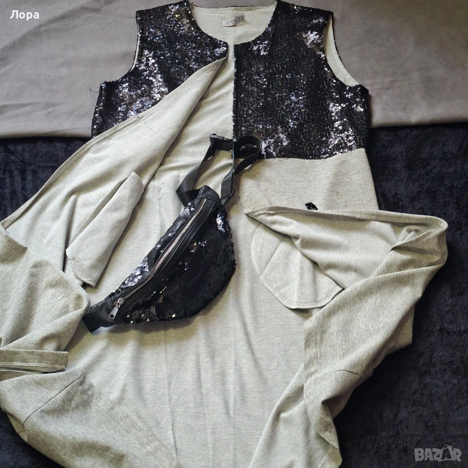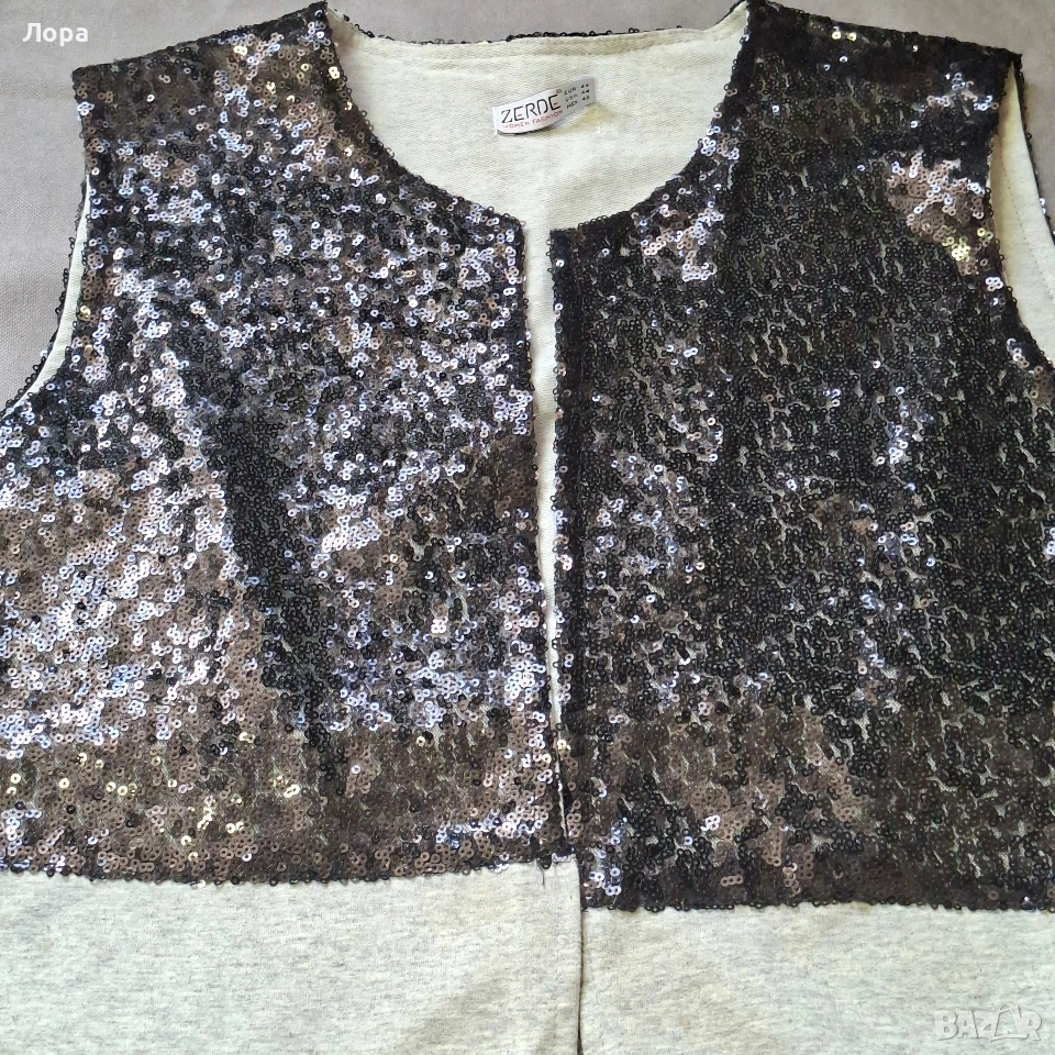 Дамски дълъг елек с пайети в горната част. В долната част е трико. Без закопчаване с два външни джоба. Размери ширина от мишница до мишница 50 см. дължина на елека 110 см. Към елека подарък чанта за кръста с пайети. Изпращам с опция преглед и тест по Еконт.