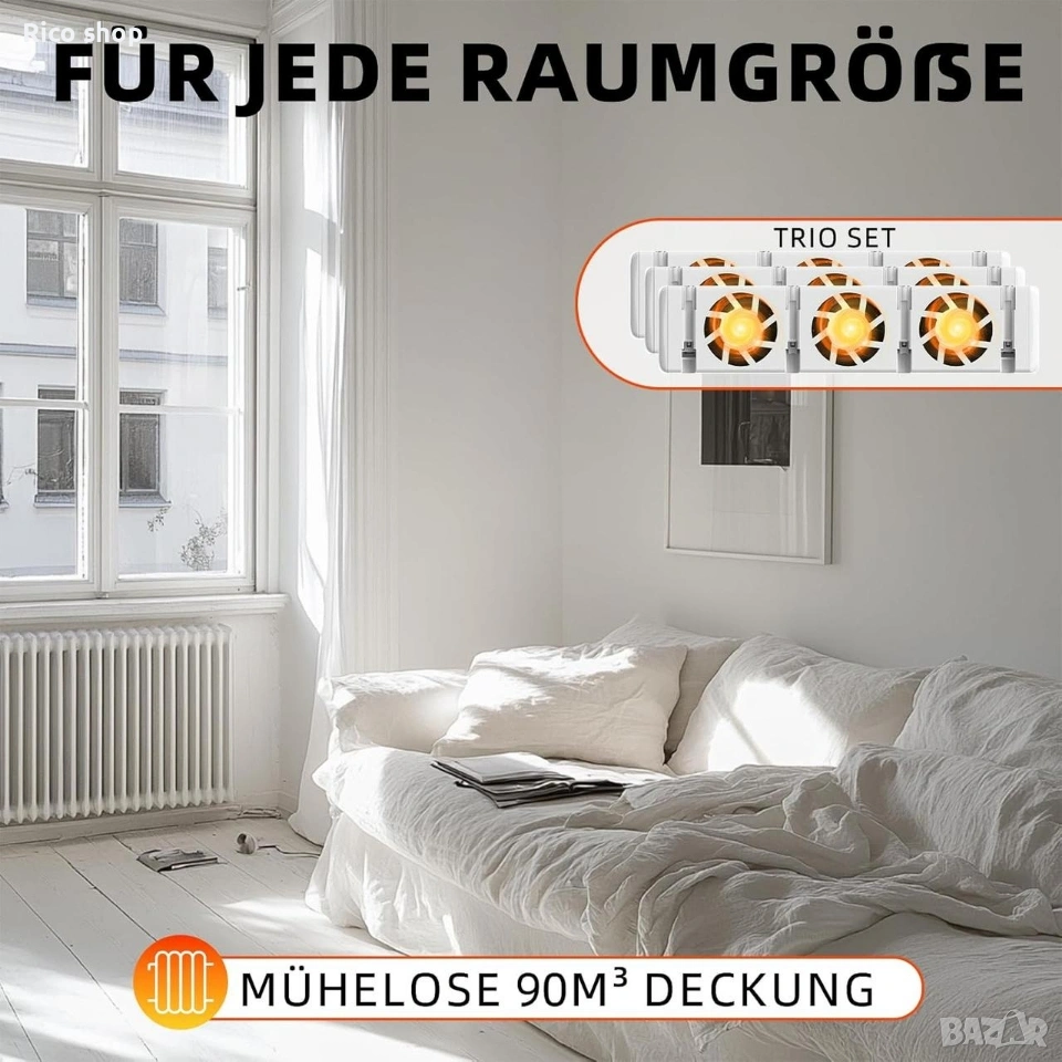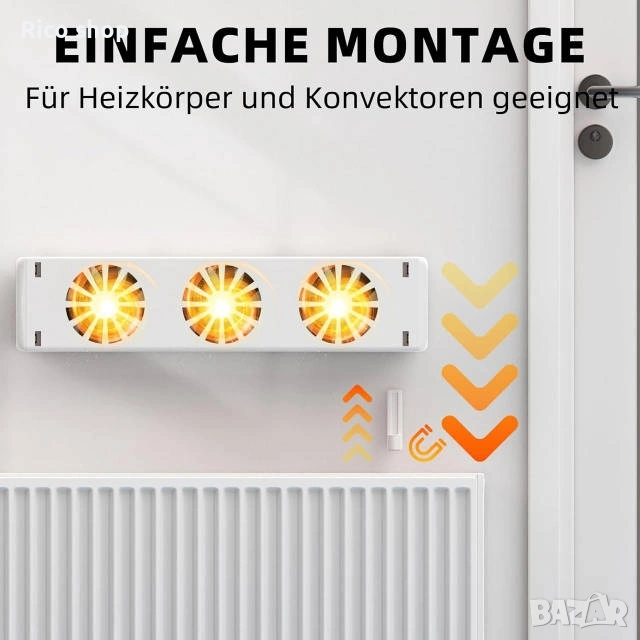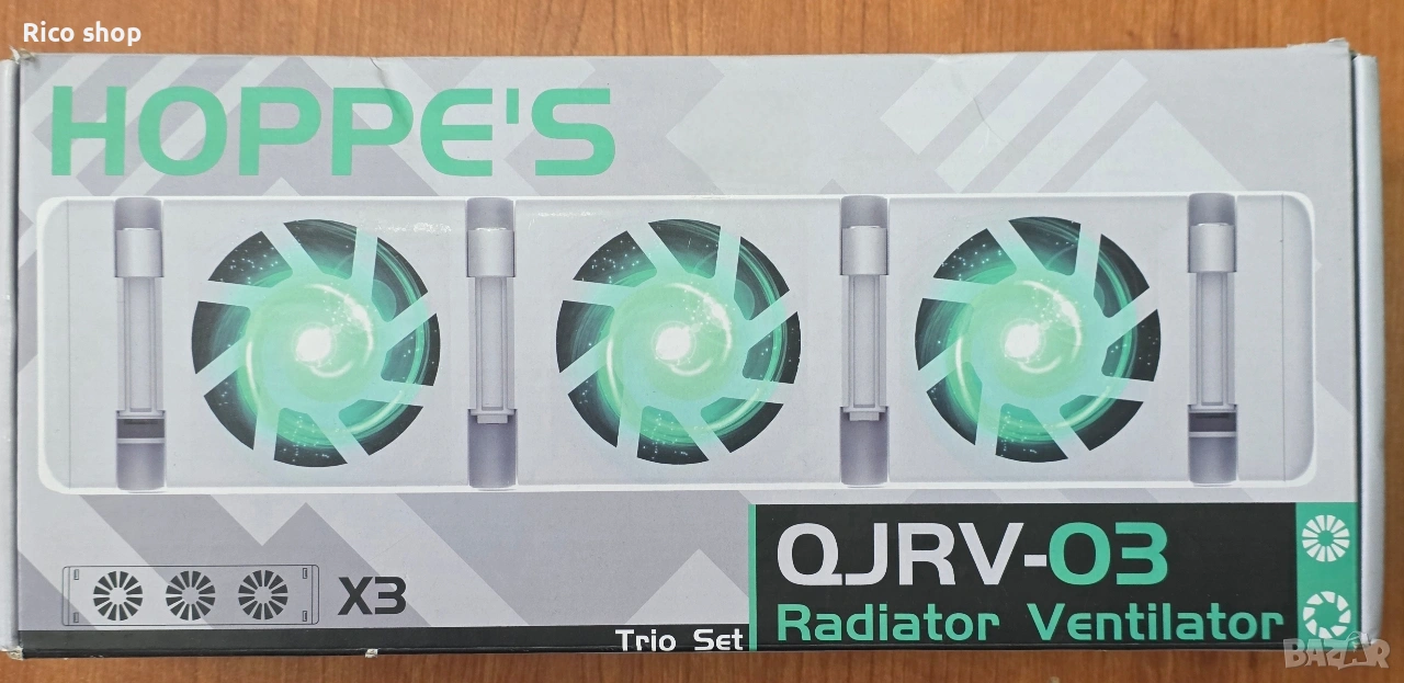 Hoppe's QJRV-03 Trio Set Radiator Ventilator, комплект интелигентни вентилатори, предназначени за подобряване на ефективността на радиаторите. Тип продукт: Комплект от 3 вентилатора за радиатор. Функция: Увеличава топлинната мощност и ускорява затоплянето на помещението. Характеристики: Автоматична работа чрез температурен сензор (включва се при 30°C, изключва се при 23°C) и USB захранване.