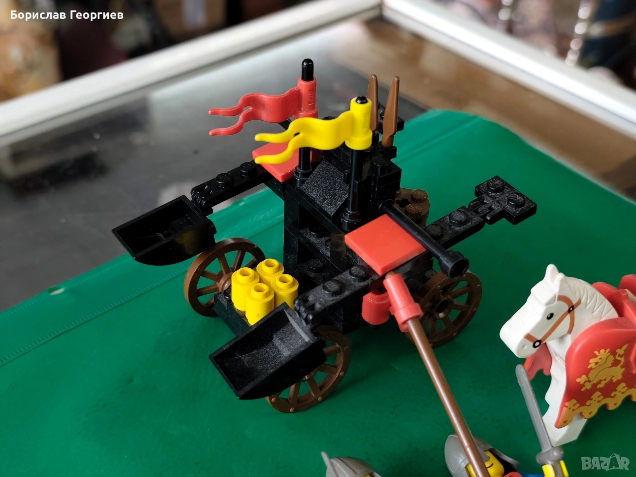 Комплекта е без кутия и книжка.Липсват двата щита и на бронята на коня двата държача са счупени.