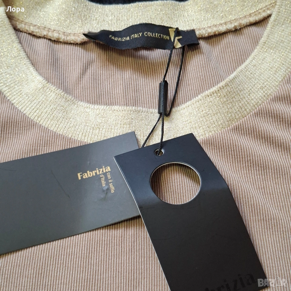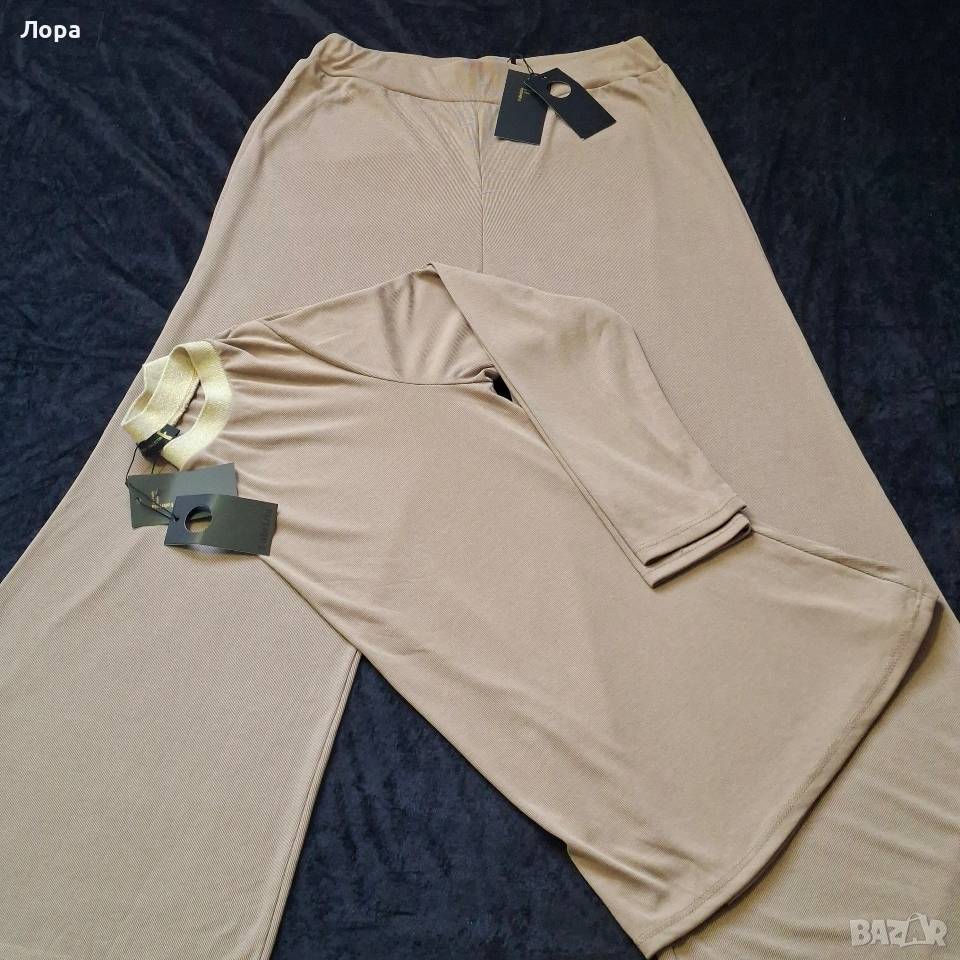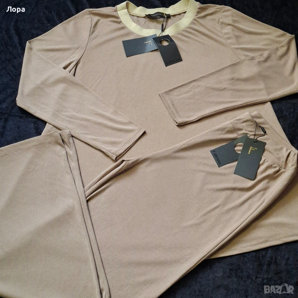 Дамски комплект панталон и блуза на фирма Fabrizia. Няма размер. Подходящ е от М до ХЛ. Размери на блузата ширина от мишница до мишница 60 см. дължина на ръкава 62 см. дължина на блузата 70 см. В долната част се разширяа и е широка 85 см. Панталона е с ластик в талията. Ширина от 35 до 65 см едностранно. Дължина от талията до долу 105 см. дължина от чатала до долу 75 см. ширина ханш от 60 до 77 см. ширина на крачола в долната част 37 см едностранно. Материята е много мека и еластична. Комплекта е подходящ за пролетта.Нов с етикет. Изпращам по Еконт с опция преглед и тест.