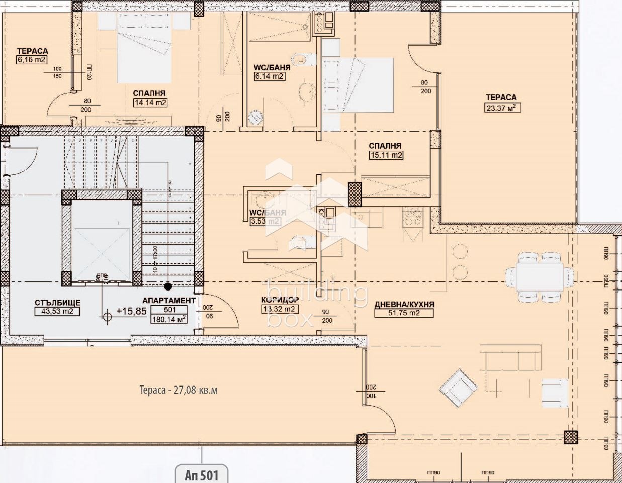 Апартаментът е с чиста застроена площ 128.82 кв.м, както и панорамни тераси с обща квадратура от 49.93 кв.м.