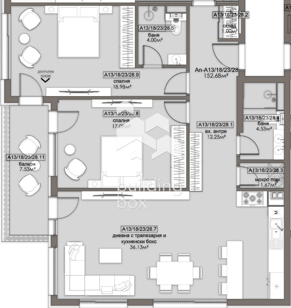 БИЛДИНГ БОКС представя сграда, която се отличава с просторни жилища с перфектно разпределение, нисък процент общи части и високо качество на строителството, изпълнено от опитни професионалисти, които осигуряват сигурност и комфорт за бъдещите обитатели.