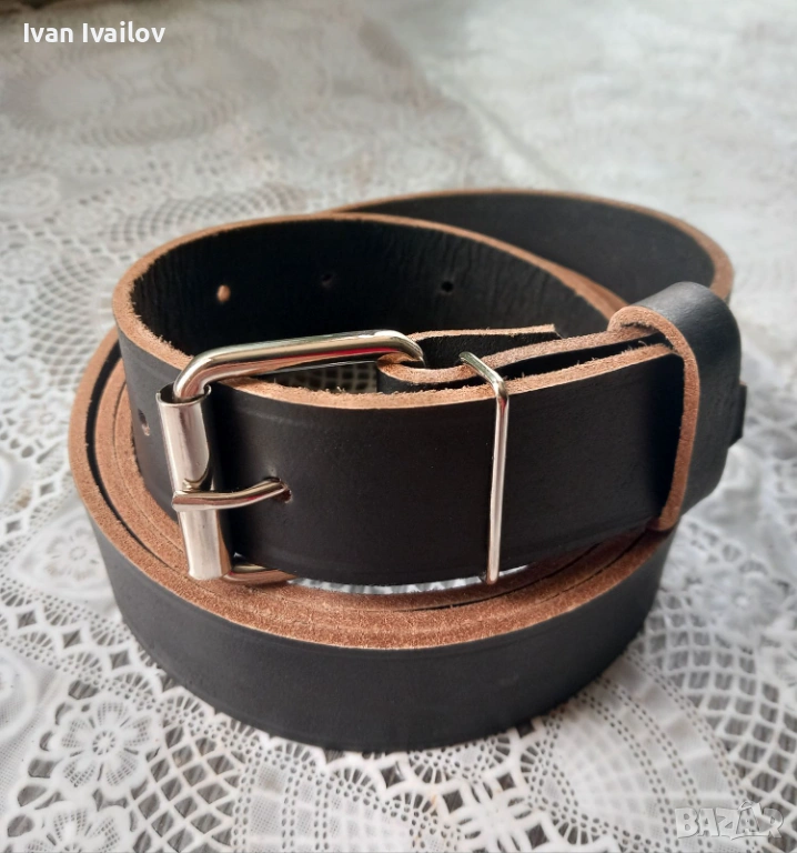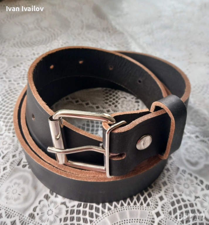 Продавам ръчно изработен мъжки колан от естествена кожа в наситено черен цвят с натурален кант (ръб). Моделът е по-гъвкав и мек, което осигурява изключителен комфорт, особено при по-големи размери.