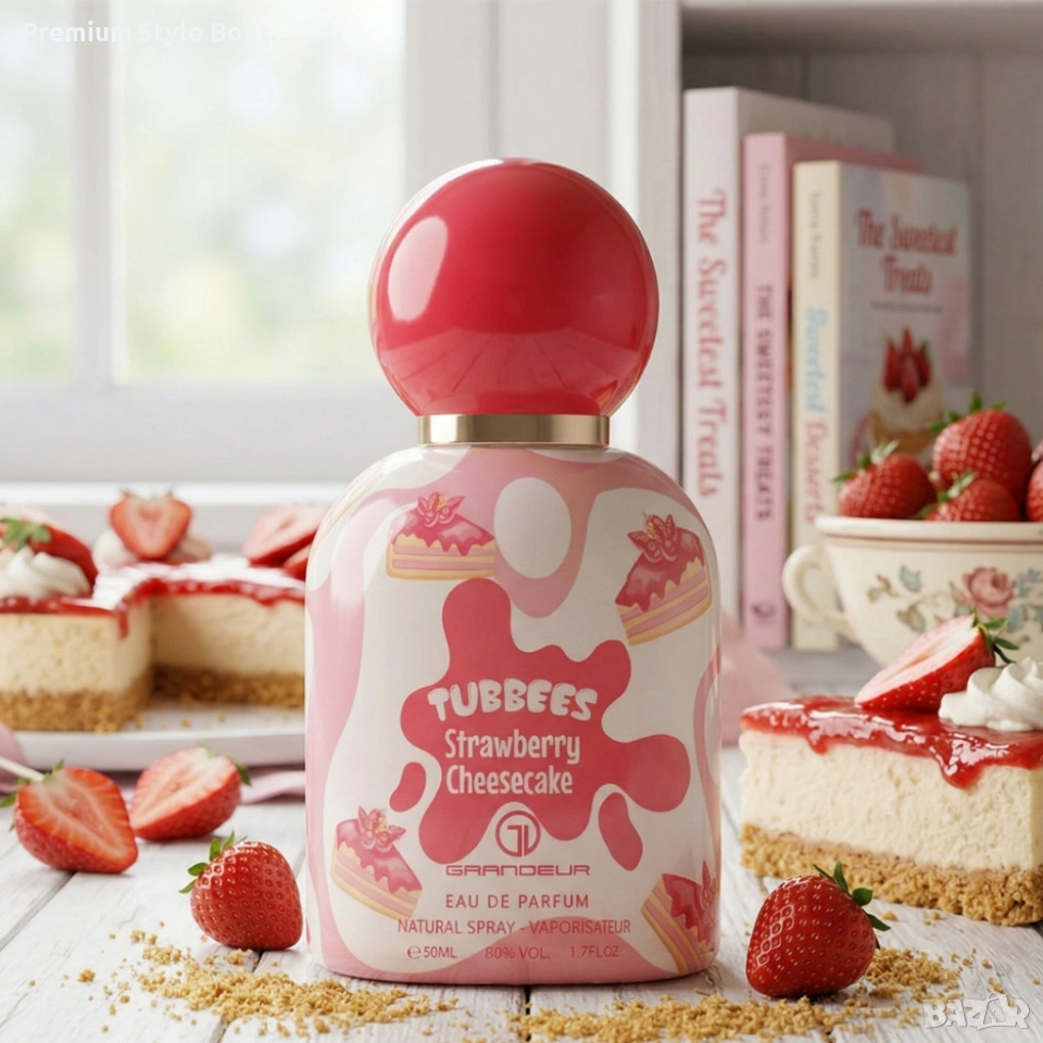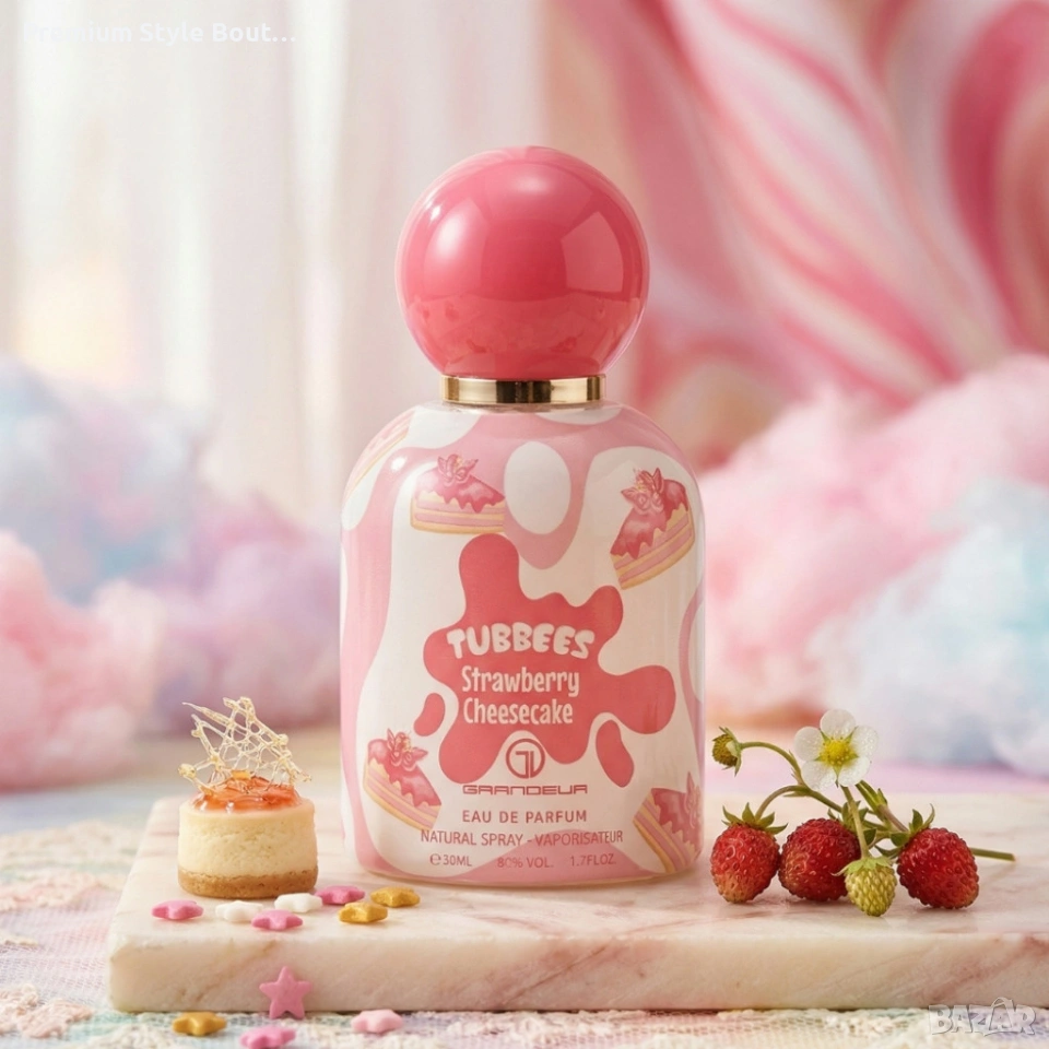 Технически характеристики на Детски парфюм Tubbees Strawberry Cheesecake 50 мл – сладък гурме аромат с ягода и ванилия Тип аромат: гурме Концентрация: парфюмна вода, 50 мл Връхни нотки: ягода, сладки нотки Сърдечни нотки: сандалово дърво, крем с бит белтък, ванилия Базови нотки: стиракс, ванилия Подходящ за: деца и тийнейджъри, ежедневна употреба и специални събития Предимства: дълготраен шлейф, безопасна формула за деликатна кожа, портативен 50 мл флакон SEO ключови думи: детски парфюм, модни аксесоари, аромат за деца, гурме аромат, стил и увереност