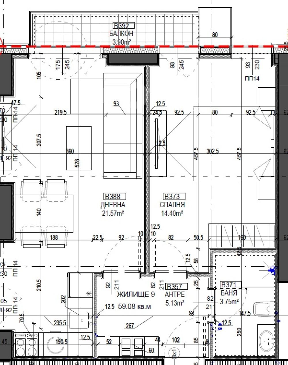 Фасадата е окачена с фасаден гранитогрес, а дебелината на изолцията е 12 см. Дограмата е от 3 слоен стъклопакет