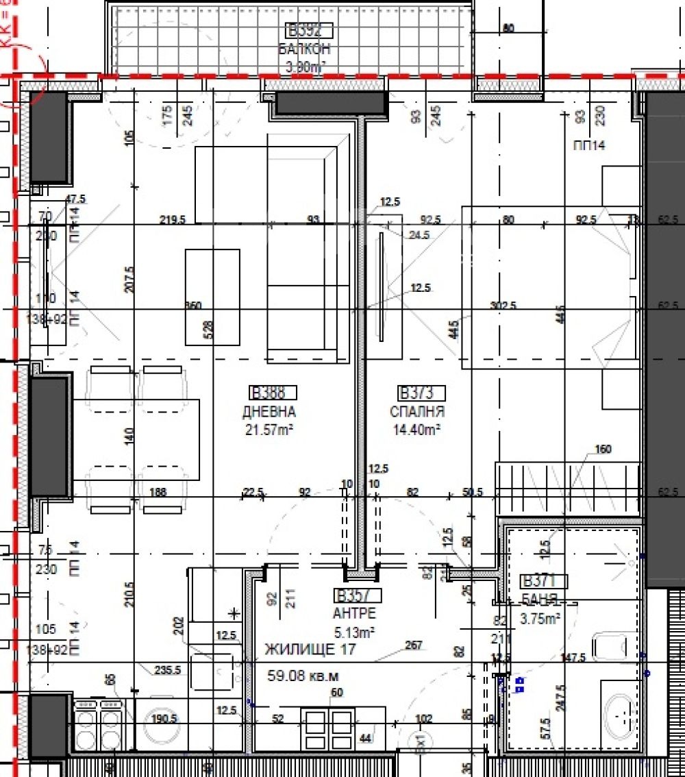 Фасадата е окачена с фасаден гранитогрес, а дебелината на изолцията е 12 см. Дограмата е от 3 слоен стъклопакет